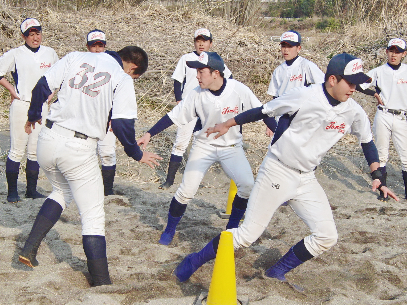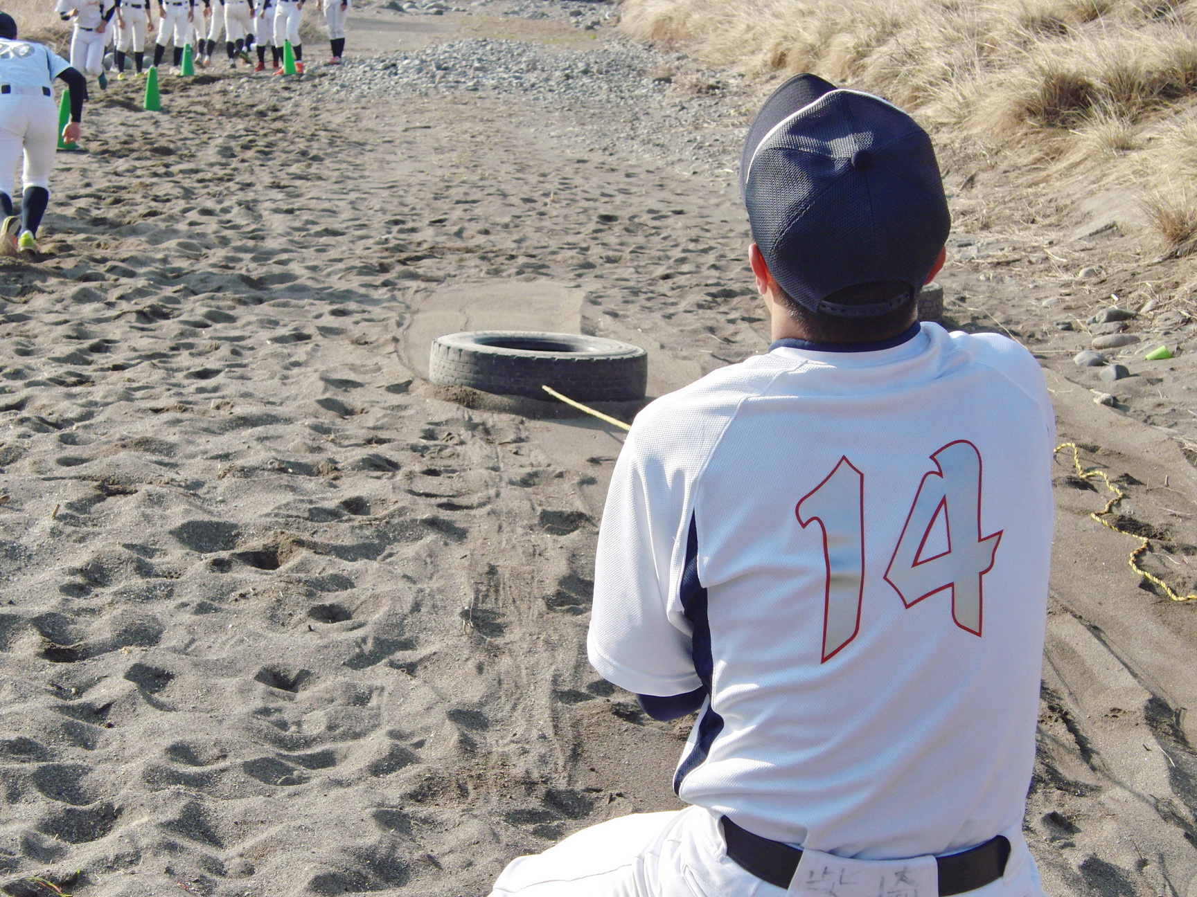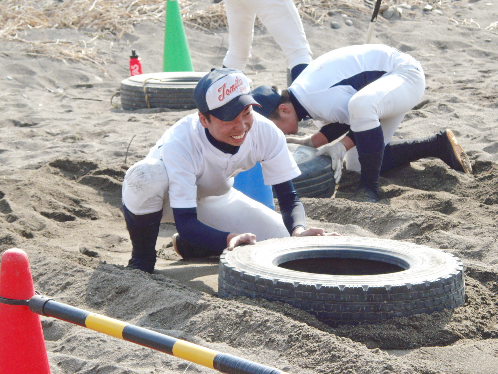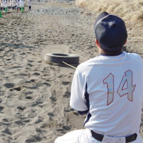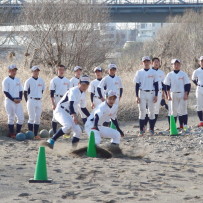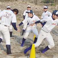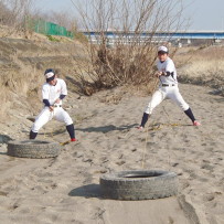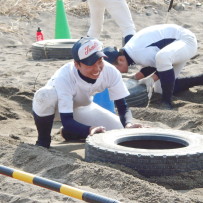 そして、地下足袋を履いての砂場トレーニングでは、2人1組でのシャトルランや、体幹、16種サーキット、手押し、抱っこ、リレー等、内容も盛りだくさんでした。皆で声をかけあったり、真剣な表情の中にも、時折笑顔を見せながら、練習に励んでいました。