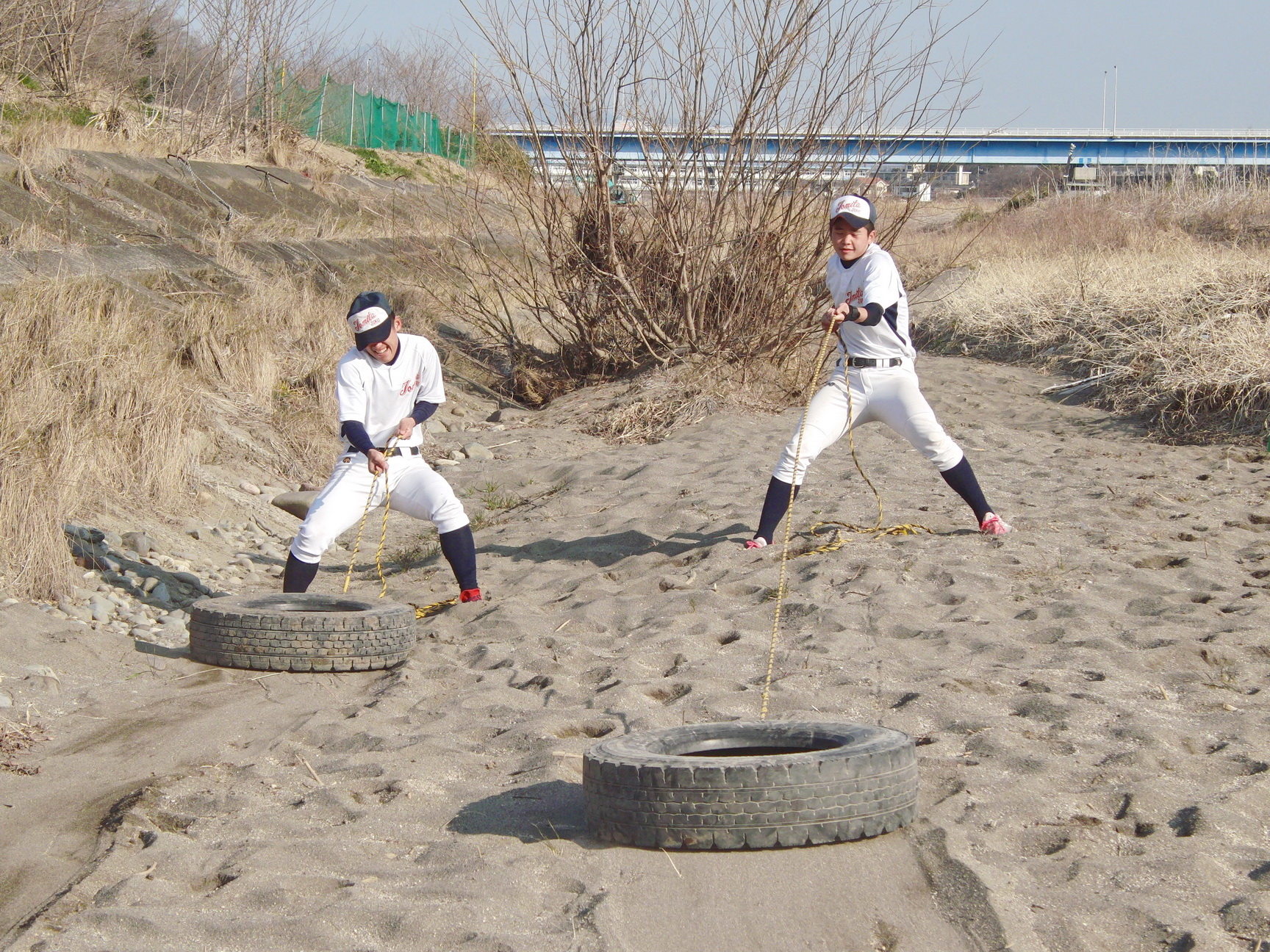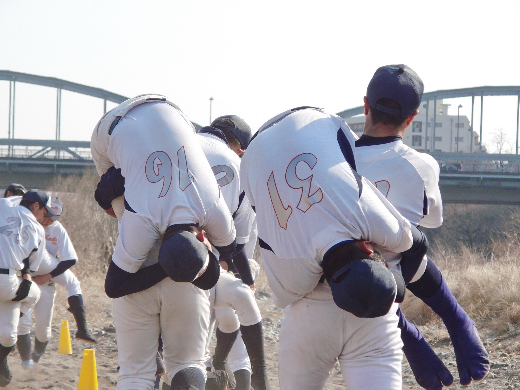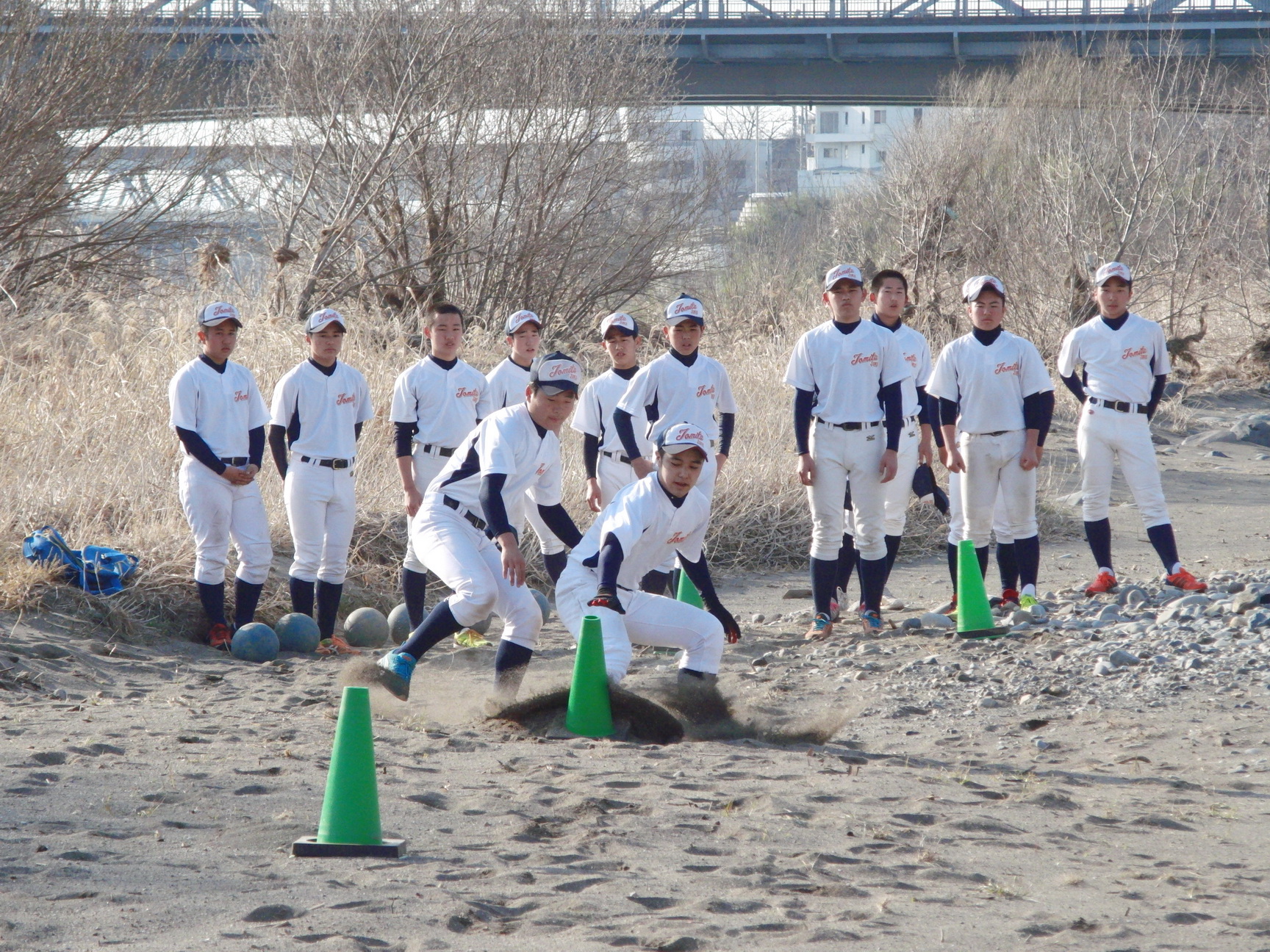 そして、地下足袋を履いての砂場トレーニングでは、2人1組でのシャトルランや、体幹、16種サーキット、手押し、抱っこ、リレー等、内容も盛りだくさんでした。皆で声をかけあったり、真剣な表情の中にも、時折笑顔を見せながら、練習に励んでいました。