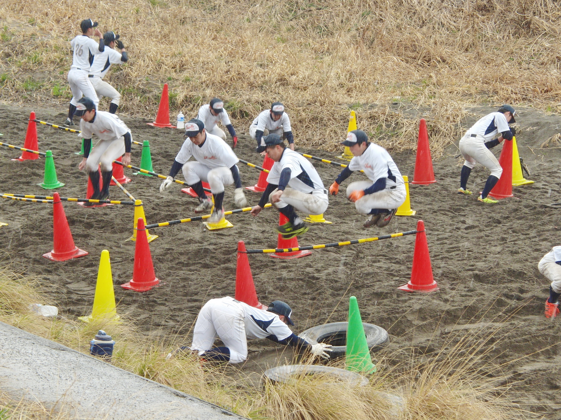 久しぶりに全員揃っての練習 写真撮影! そして外周からの練習が始まり 砂場での16種サーキット 砂場の上では 砂浜に足を取られ思うように足が動かない塾生達!