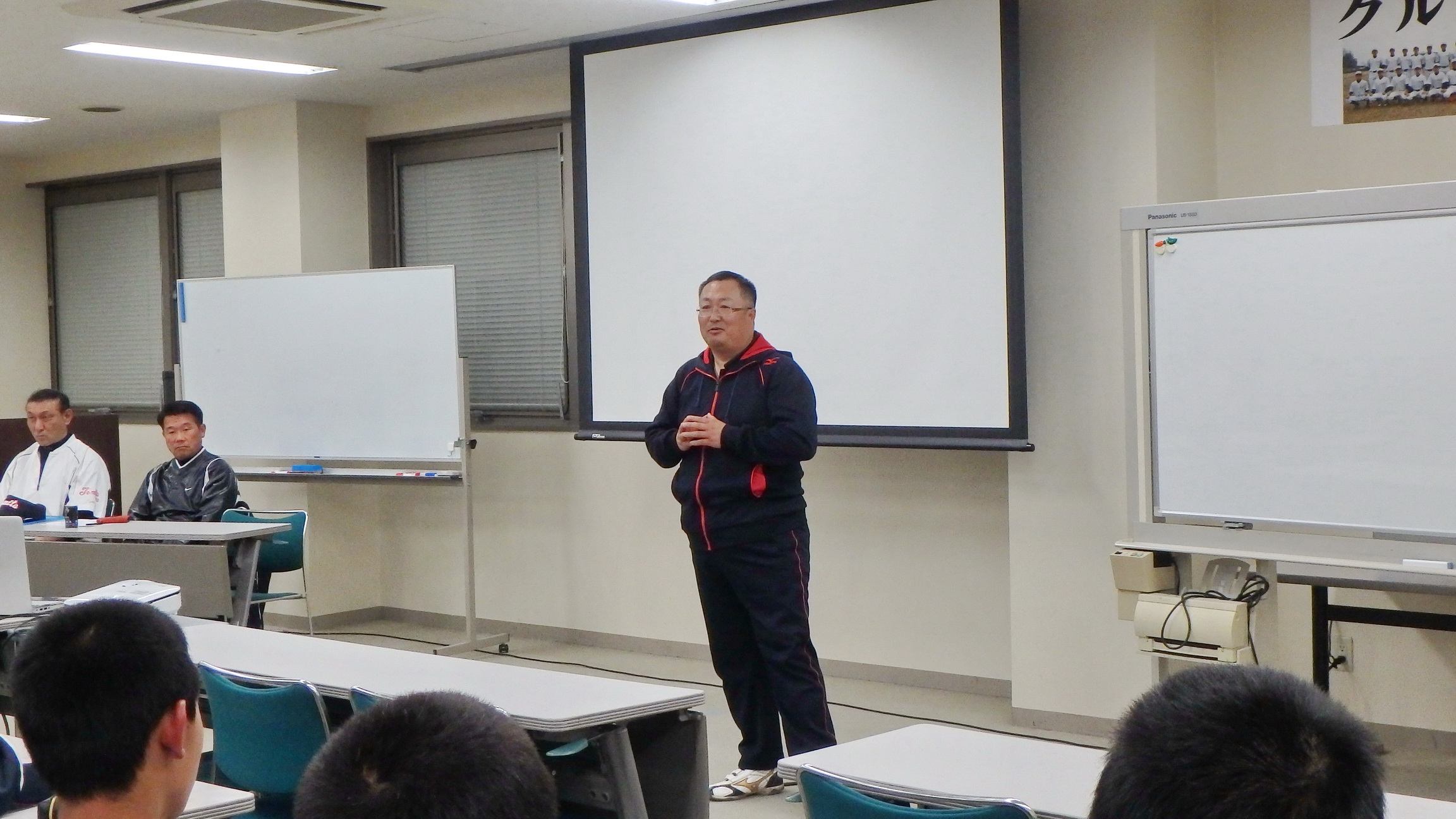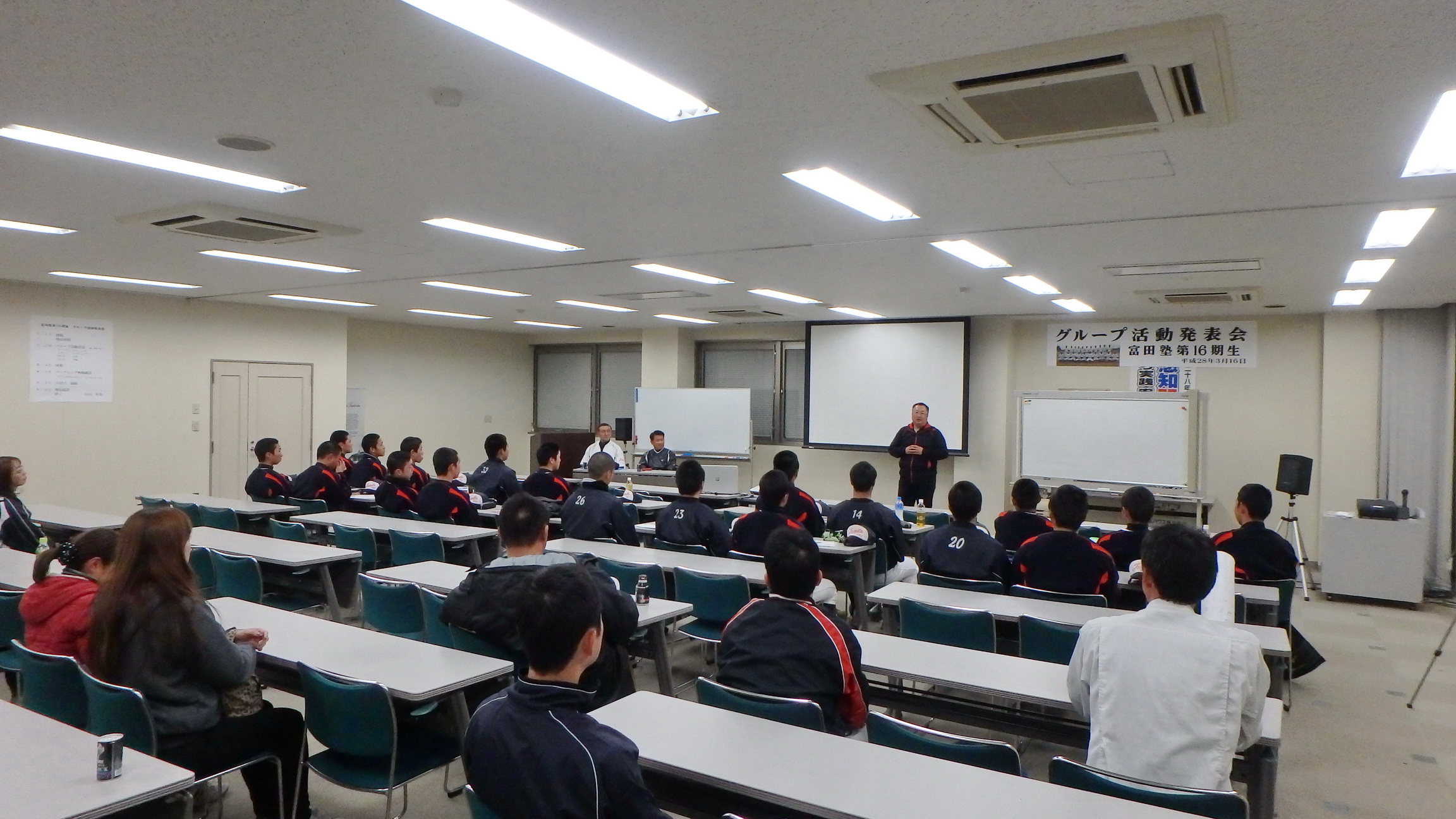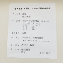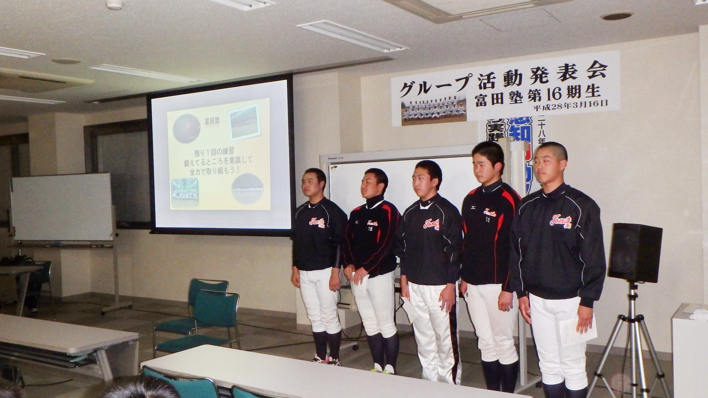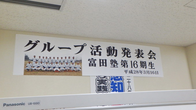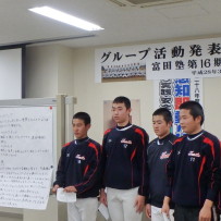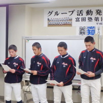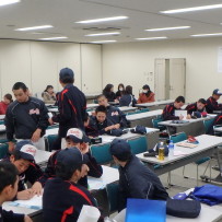 それぞれが工夫をこらし、内容の濃い発表会になりました。その後、都丸事務局長と江崎コーチによる、個々のバッティングフォームのテクニカルコメントがあり、塾生は熱心に聞き入っていました。