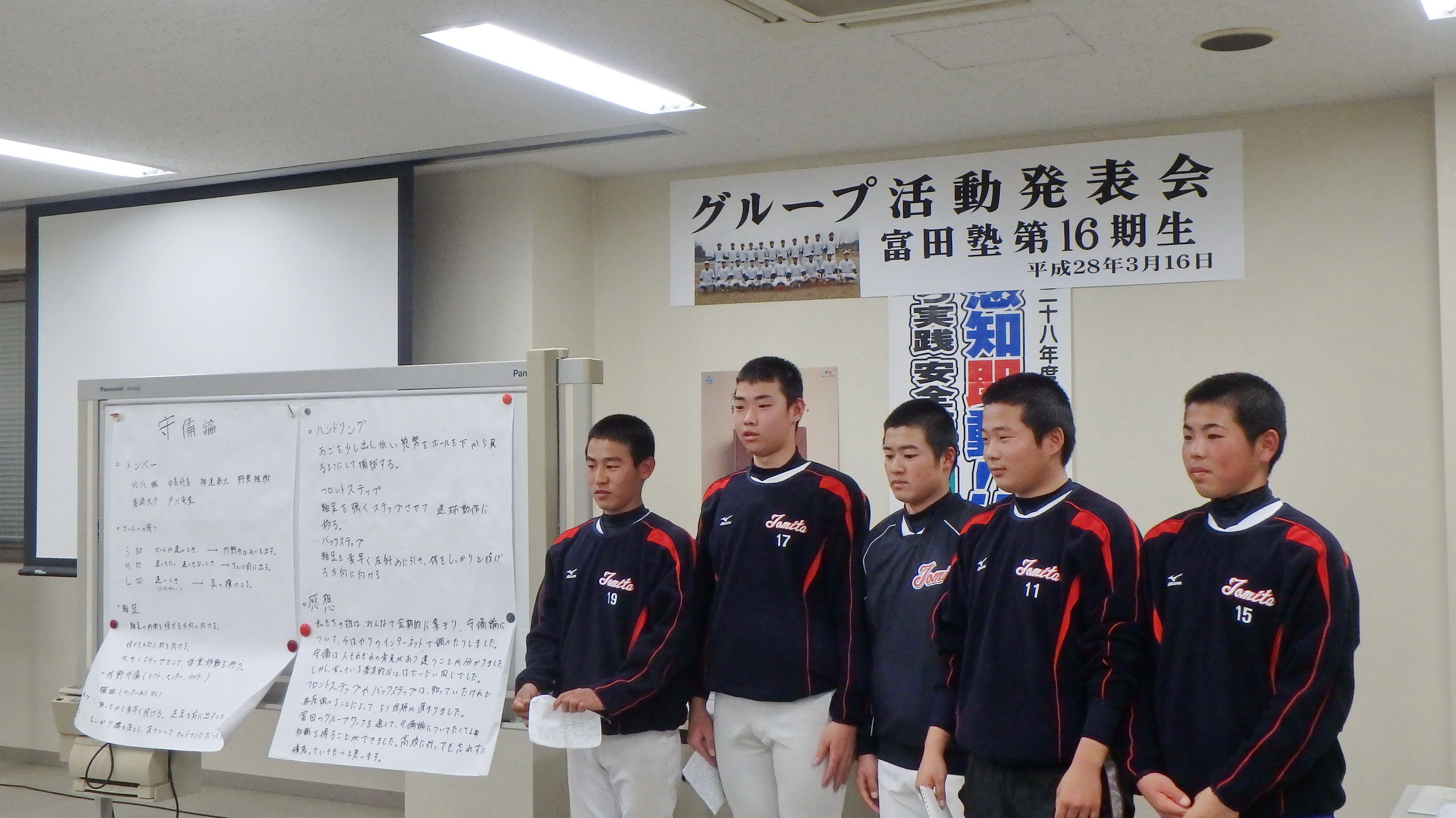 今日は去年から取り組んでいる、グループ活動の発表会である。それぞれの班に分かれ、野球の要素である走塁、打撃、守備、トレーニングに分けて、各グループごとに話し合いを行い、個々の考えを整理していよいよ発表❗️