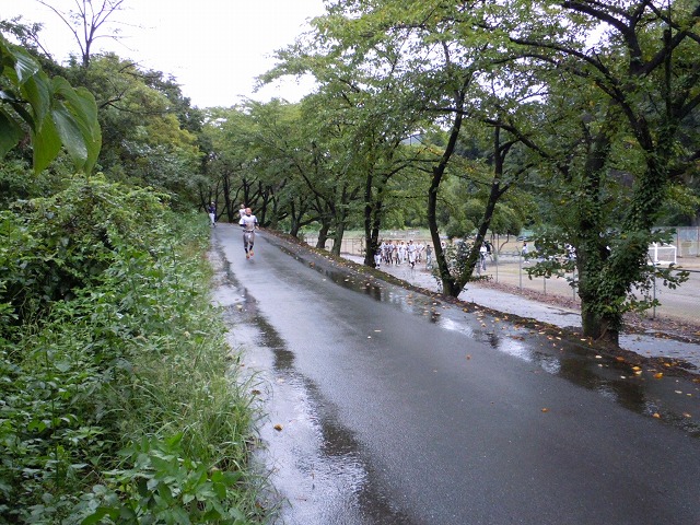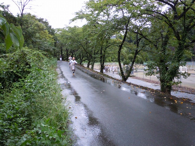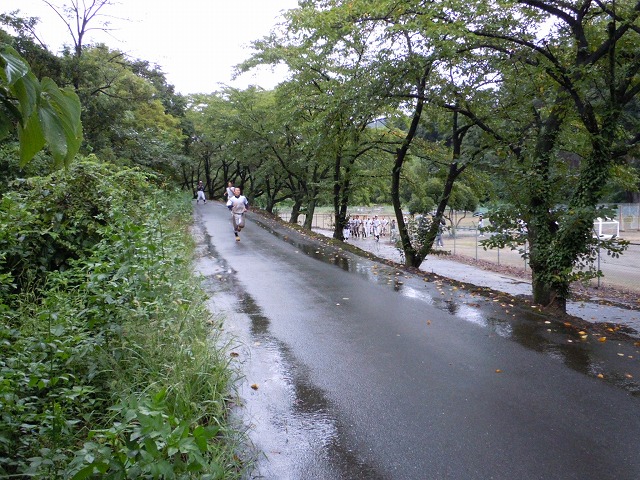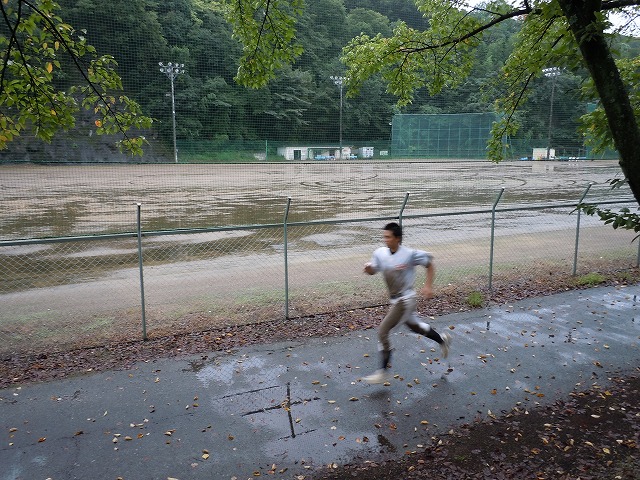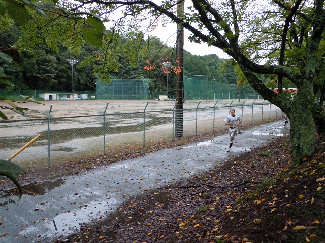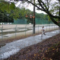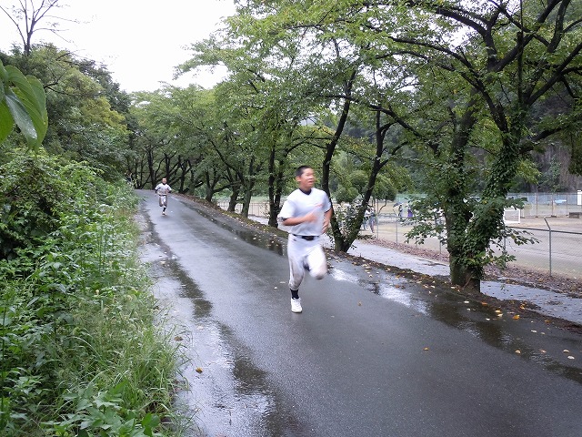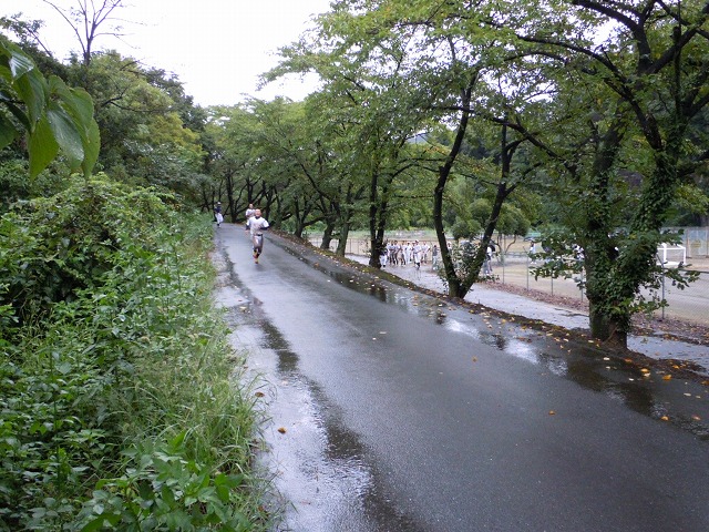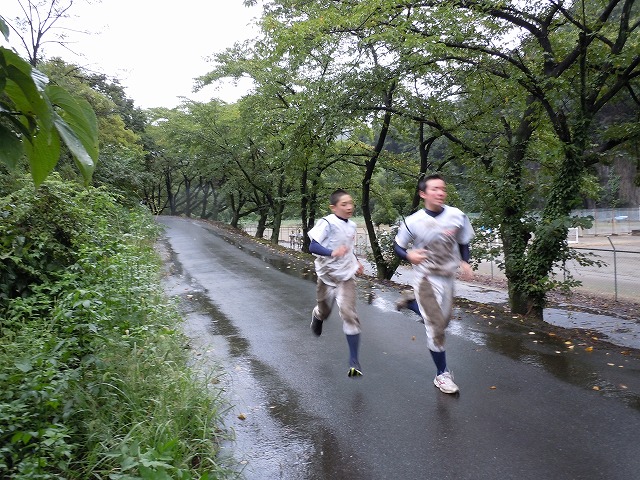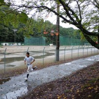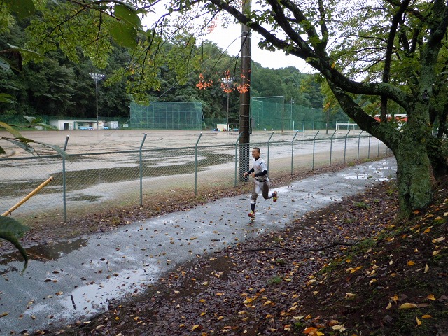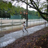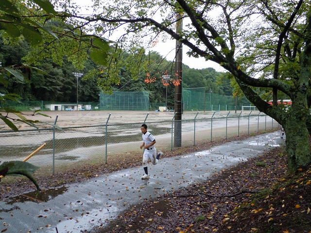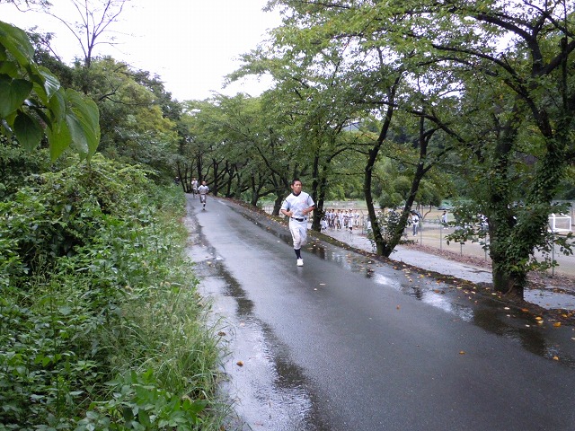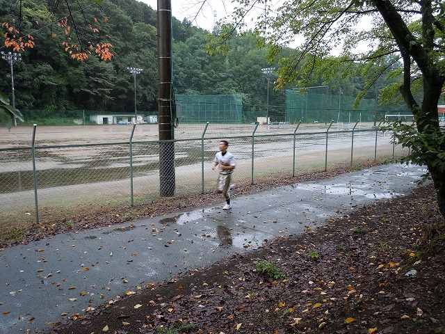 午後は雨が激しさを増してきました。場所をグラウンドの外に移しての走り込みです。