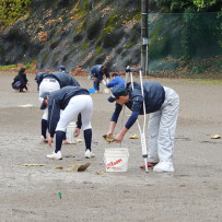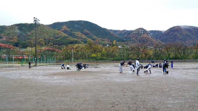 前日の雨の為、今日は朝から全員でグランドの水取りをしました。やっとの事で内野の水取りが終わりかけてたところ、また雨(涙)。雨が弱まるまで待機し再度水取り。全員で力を合わせドロドロになりながら何とか午前中で内野の水取りを終わらせられ午後から練習が出来るようになりました。