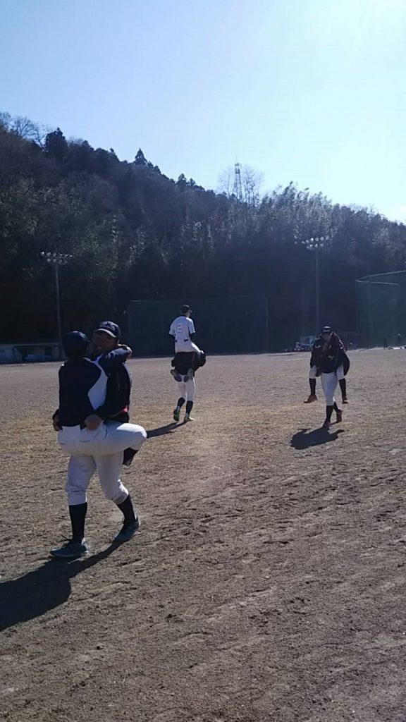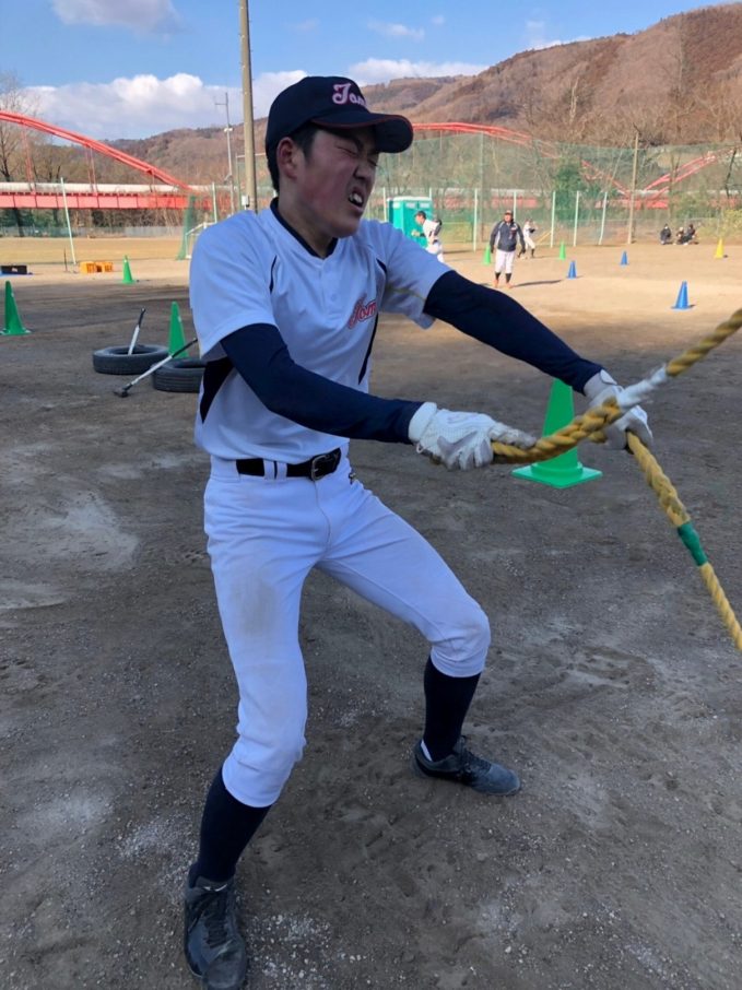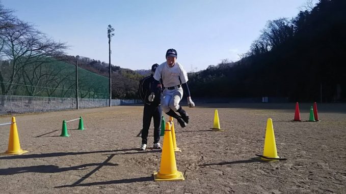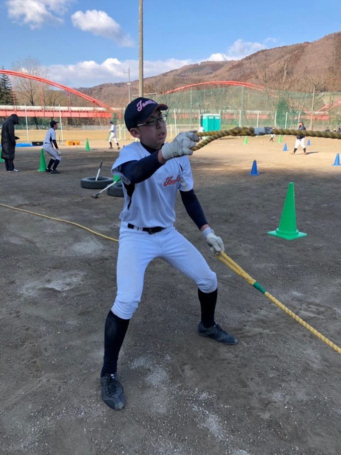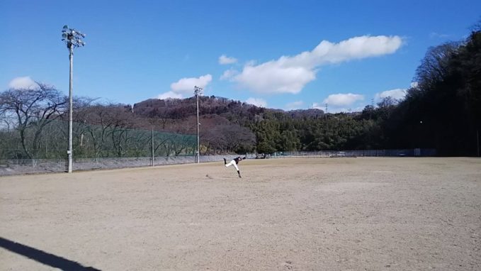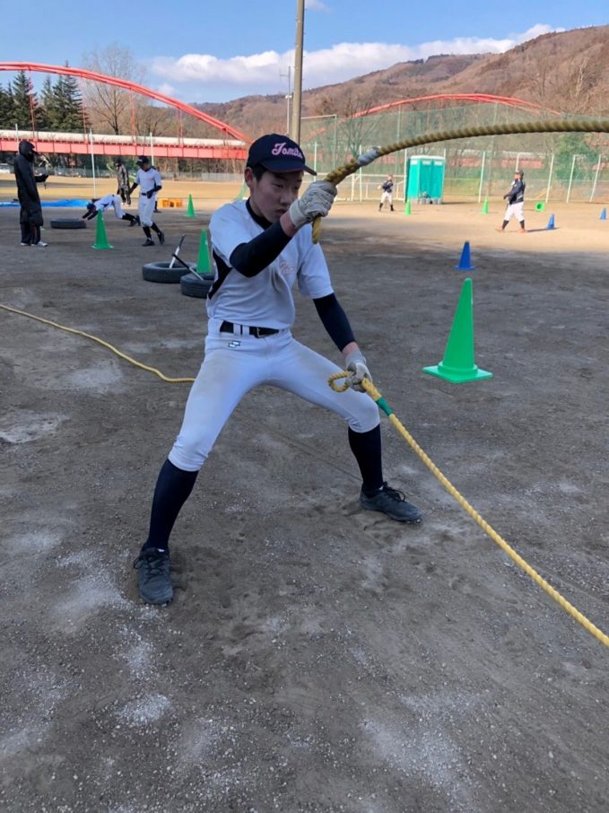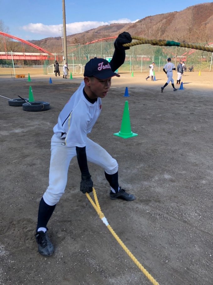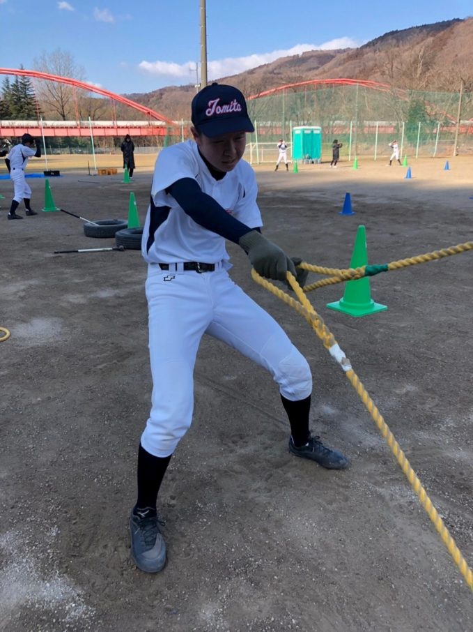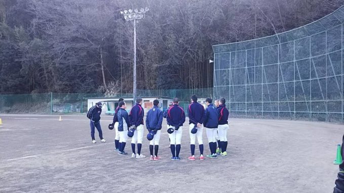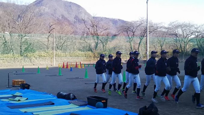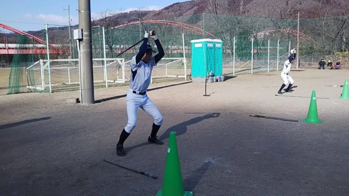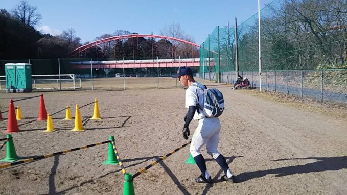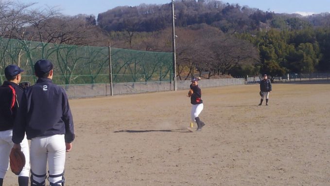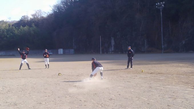 小雪も止み大きな掛け声と共に練習が始まる。 陸トレ・バッティングと練習をこなし守備練習へ…。外野捕球からバックホームへ返球する流れの練習で、捕球までの距離感や捕球から送球までの早さ、位置どりの難しさに苦戦する姿も見られた。