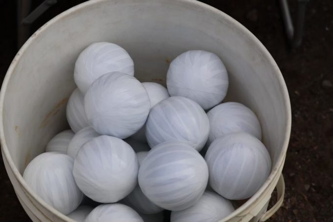 母たちはボールに巻いてある古いテープを剥がし、新しいテープを巻く作業を行いました。