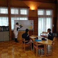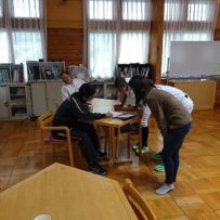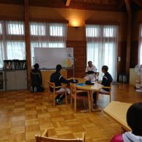 お昼休憩ではいろいろな話をしながら急遽俳句を披露することになった塾生。季語を入れ即興で考え発表していました。