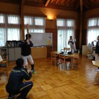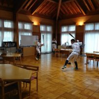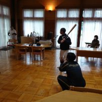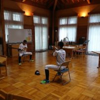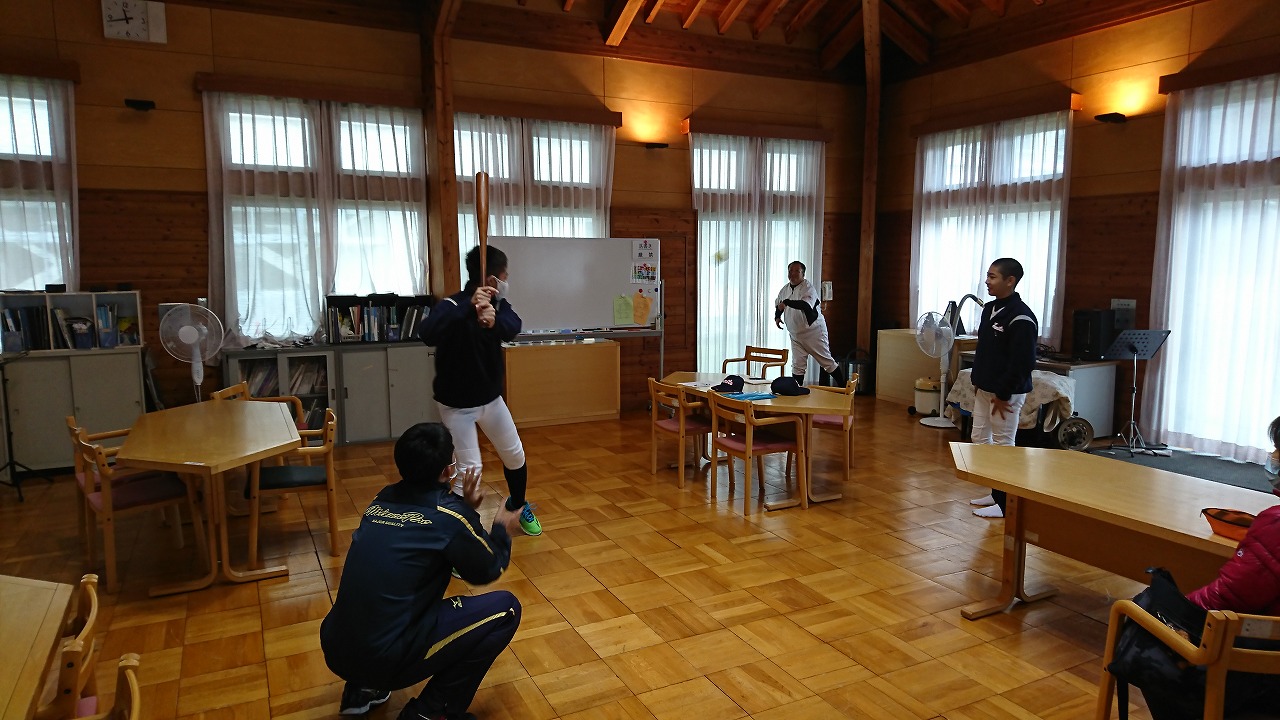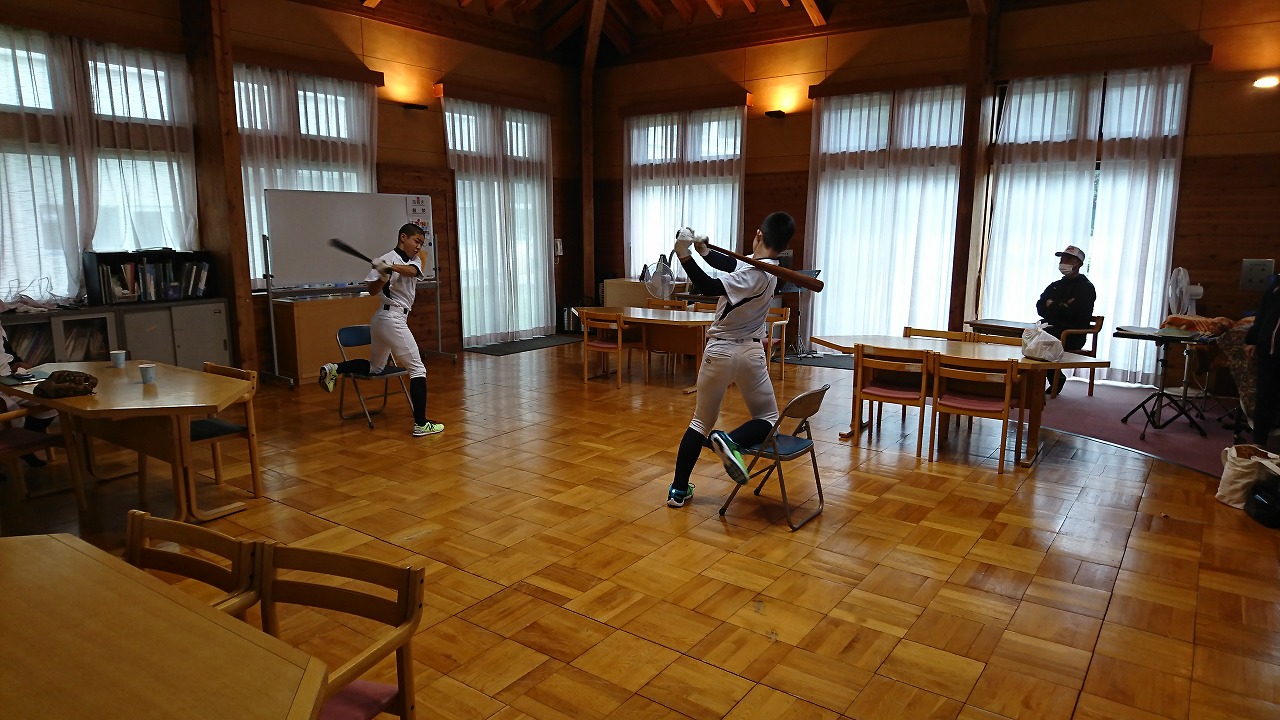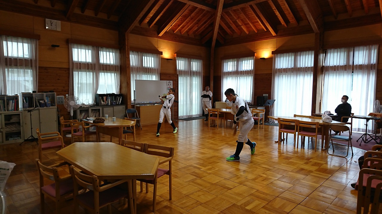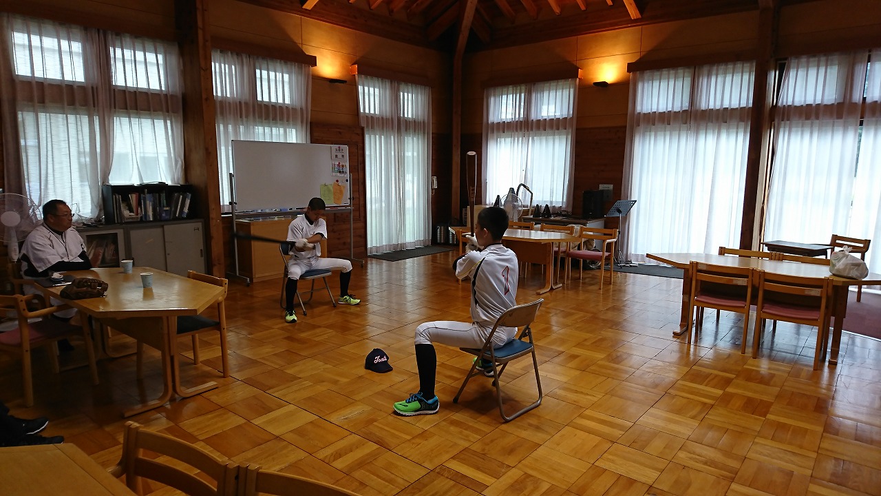 本日は2名での活動。午前中はカウント毎のバッターとしての考え方、キャッチャーとしての考え方、イニング毎の守備位置等々普段何気なくプレーしていたことを、考えて自分の言葉で伝える塾生達。