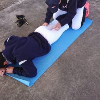 疲れた体をマッサージしながら恒例の小テスト。台形の公式は? 愛知県の県庁所在地は?