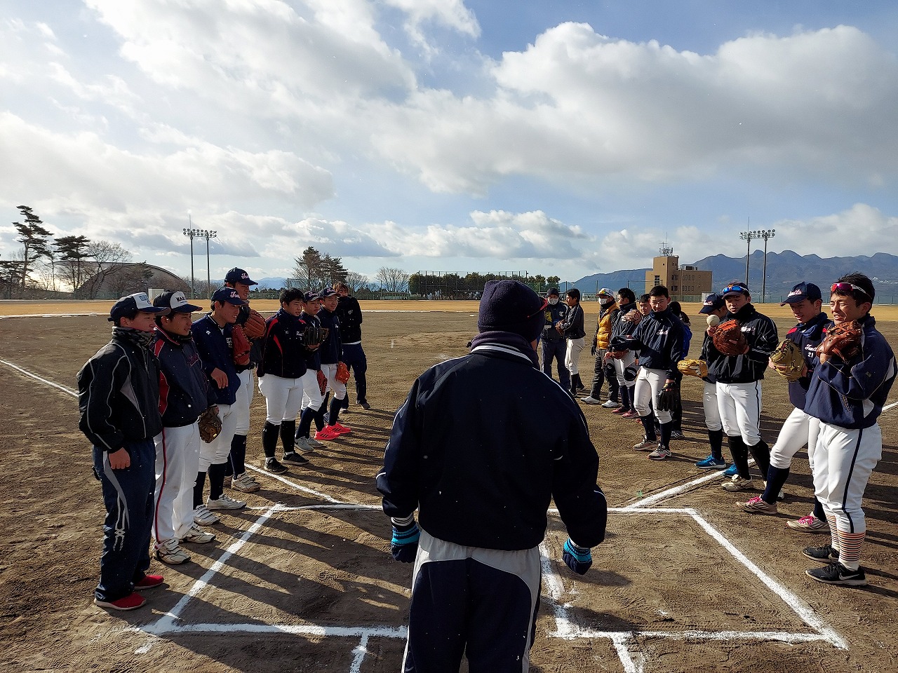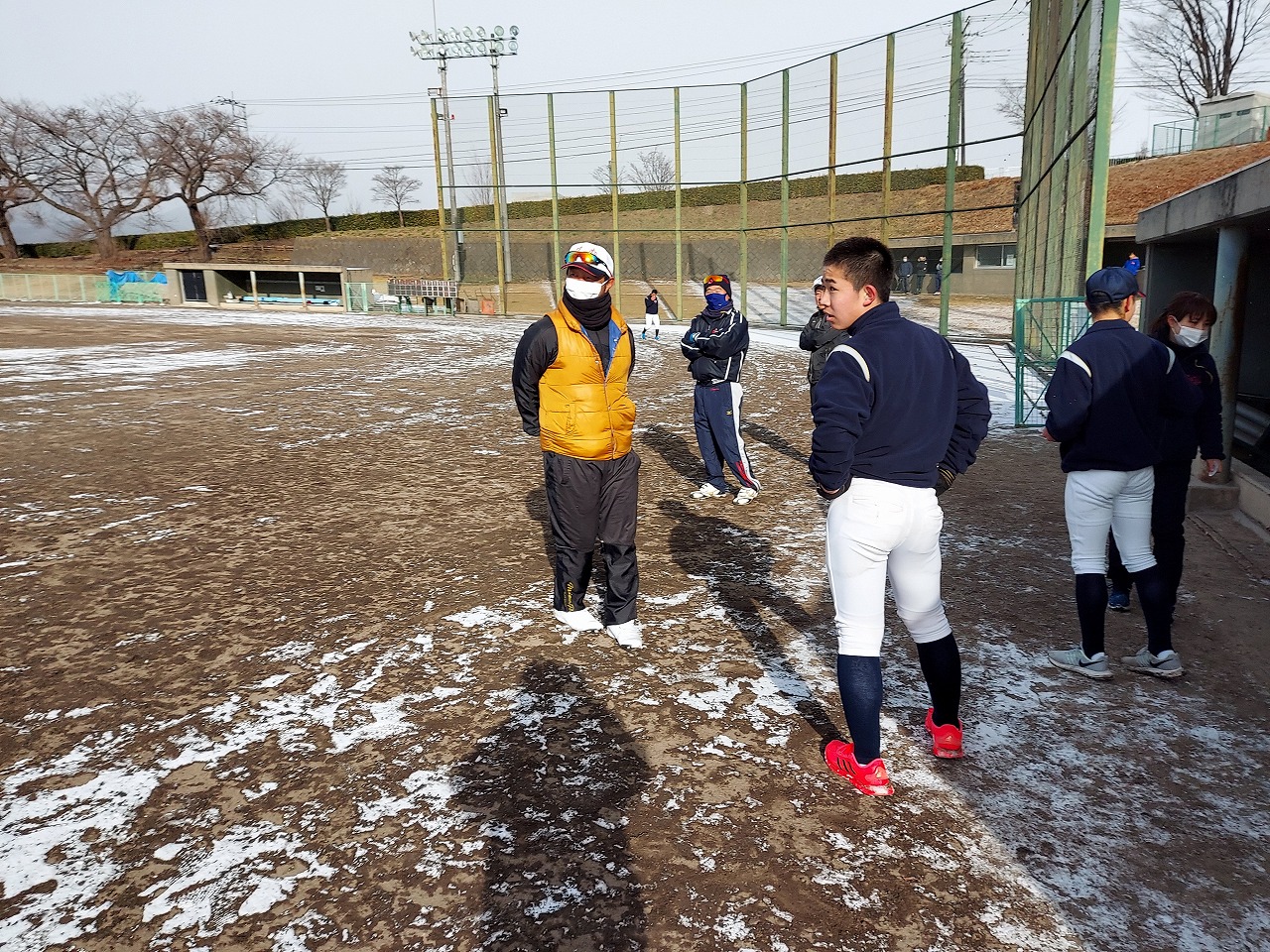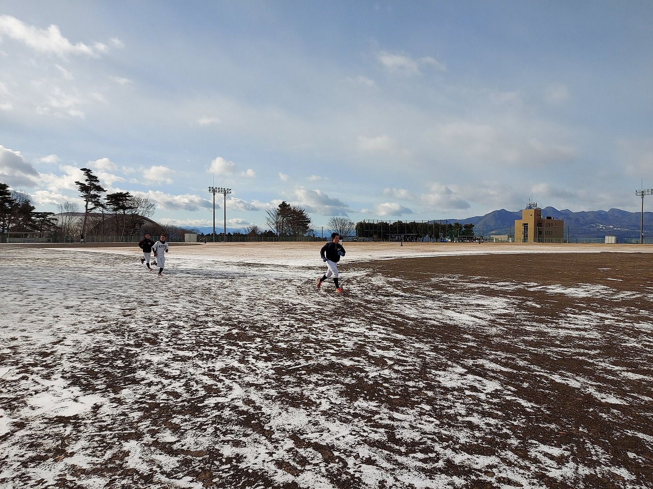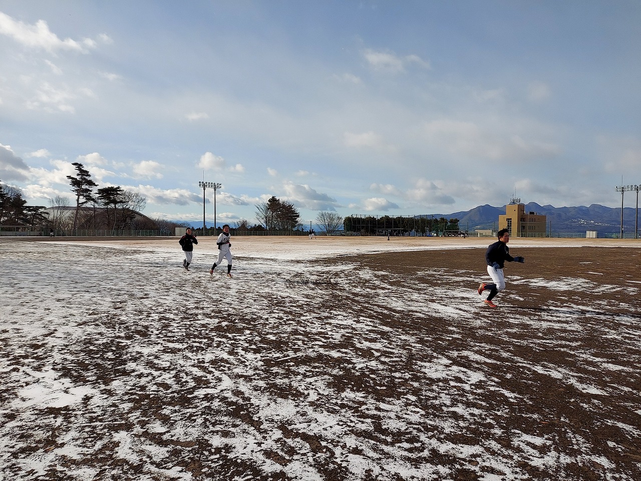 本日は場所を赤城総合グランドに移して恒例の駅伝。まさかの雪模様でグランド内をマラソンに変更。13期生、16期生、18期生がお手伝いしてくれました。高校3年生の18期生は夏から少し野球から遠ざかっていたかもしれませんが、さすがは高校生という動き。13期生・16期生も負けじと頑張っていました。