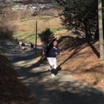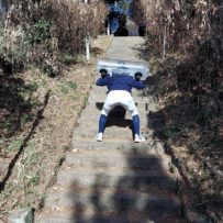 まずは軽めのアップから。何往復もするんだろうなーと予想していた塾生たち。階段往復はは1回だけという塾長からの優しいメニューを聞き、少しほっとした様子。