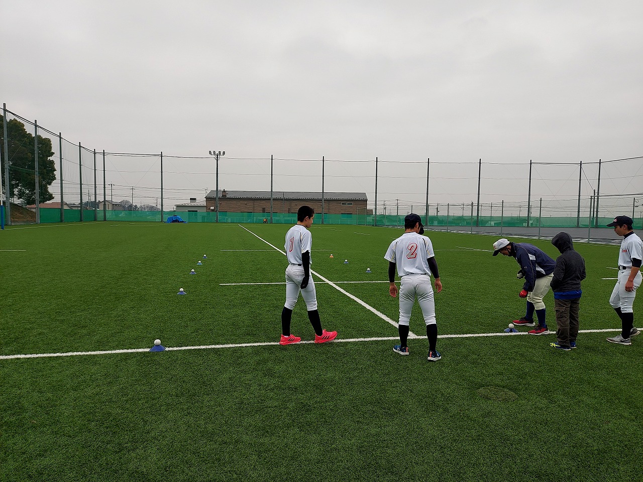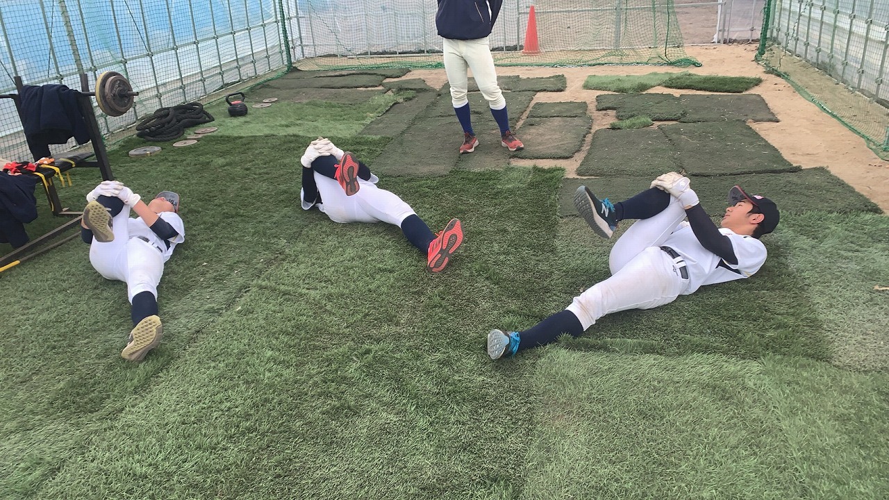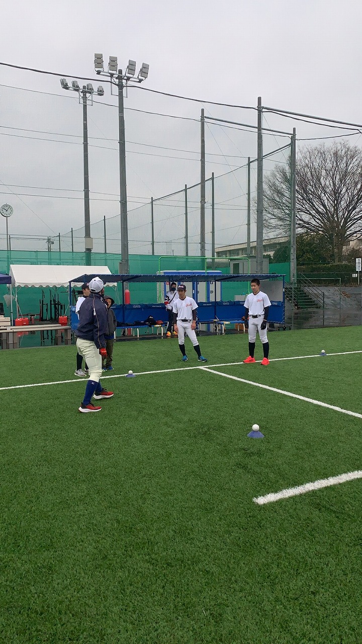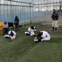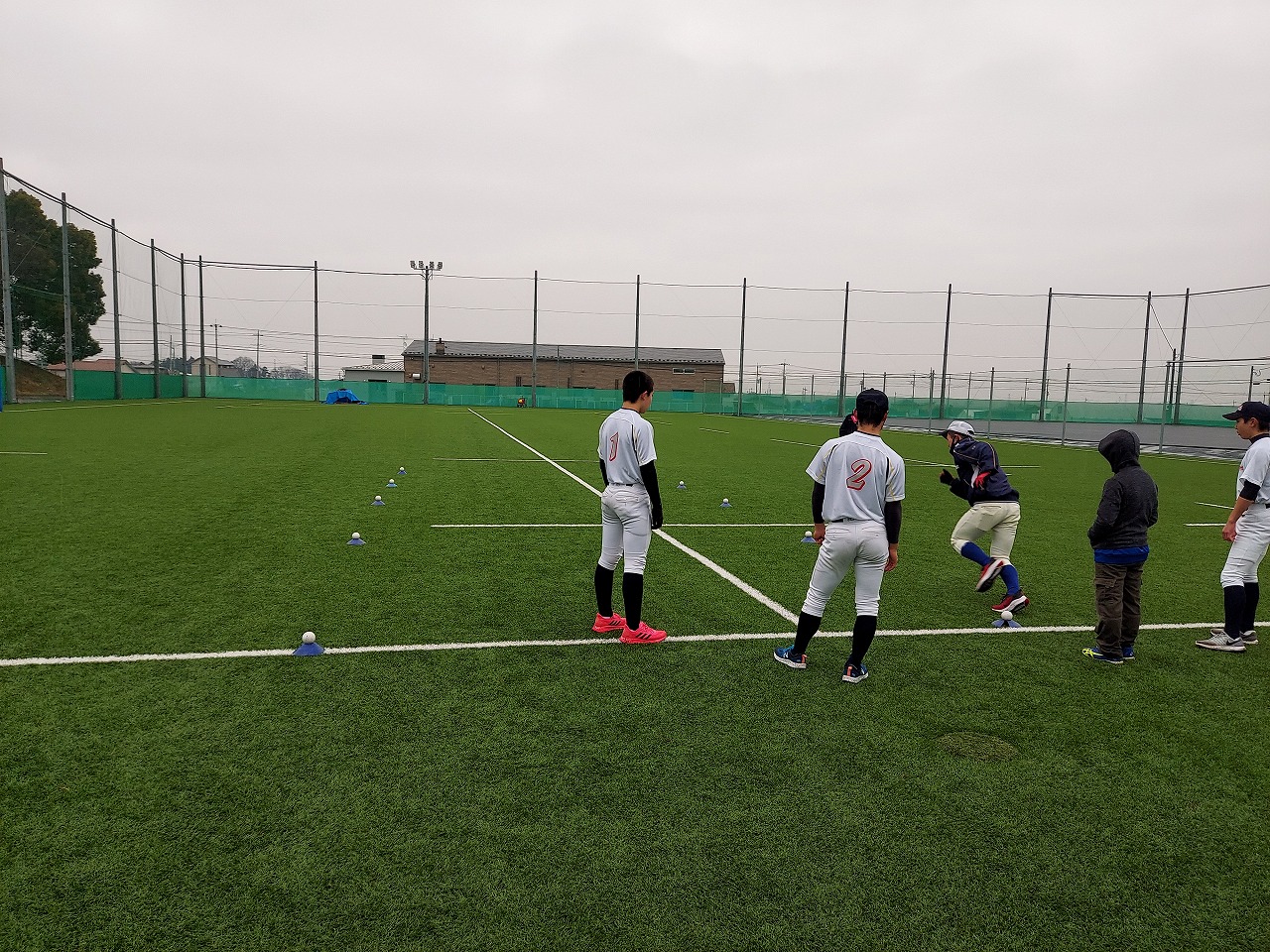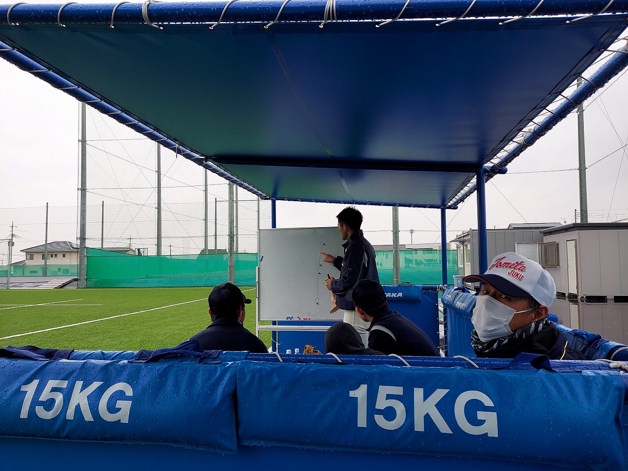 全国大会の花園に出場したラグビー部の練習場所で塾生たちの気持ちも高まりました。雨模様でしたが、人工芝は雨にも強い。瞬発系メニューを中心にこなしました。高橋コーチから高校野球の練習などをボードを使って教えてもらい、グランドを支配することの大切さを知った塾生たち。