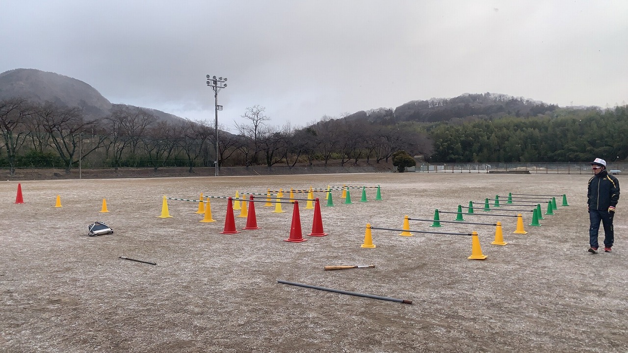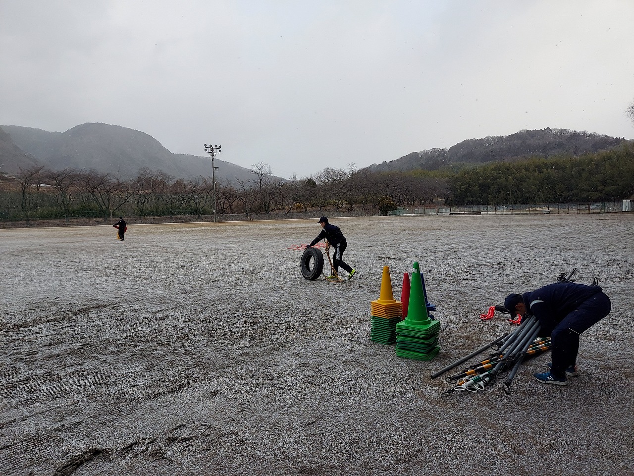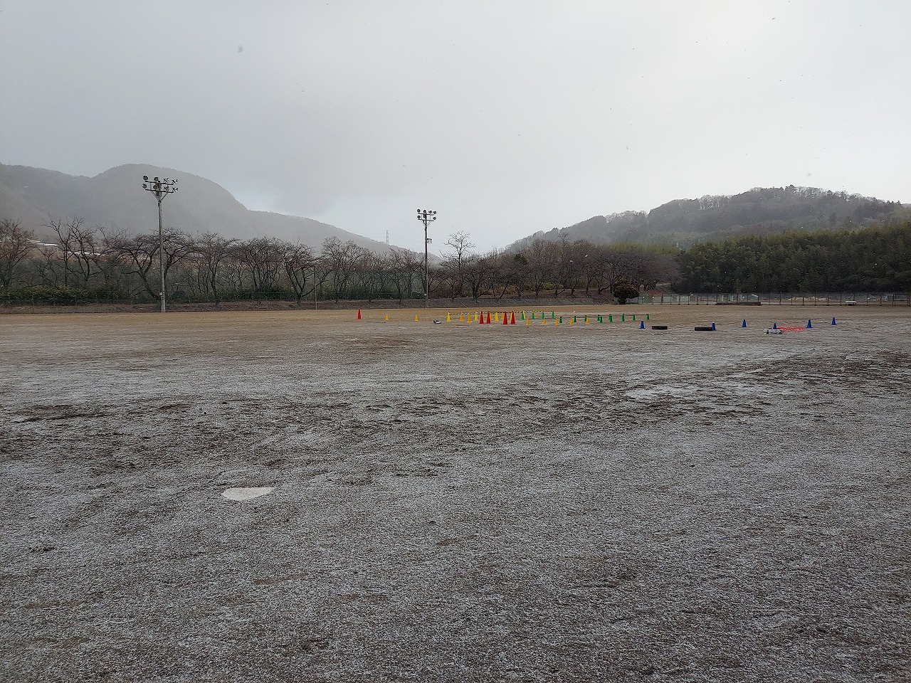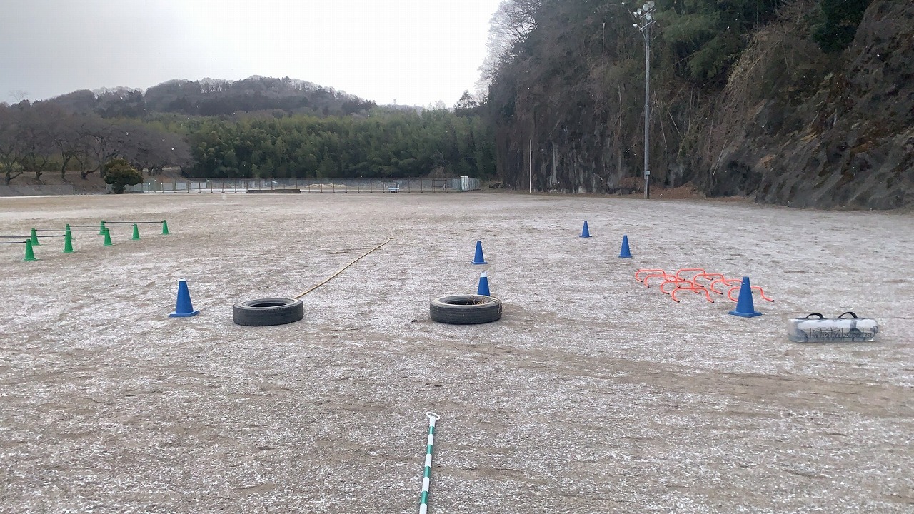 先週とは打って変わって、まさかの雪。グランドにはうっすらと雪が積もっていました。事前練習は室内で行いました。