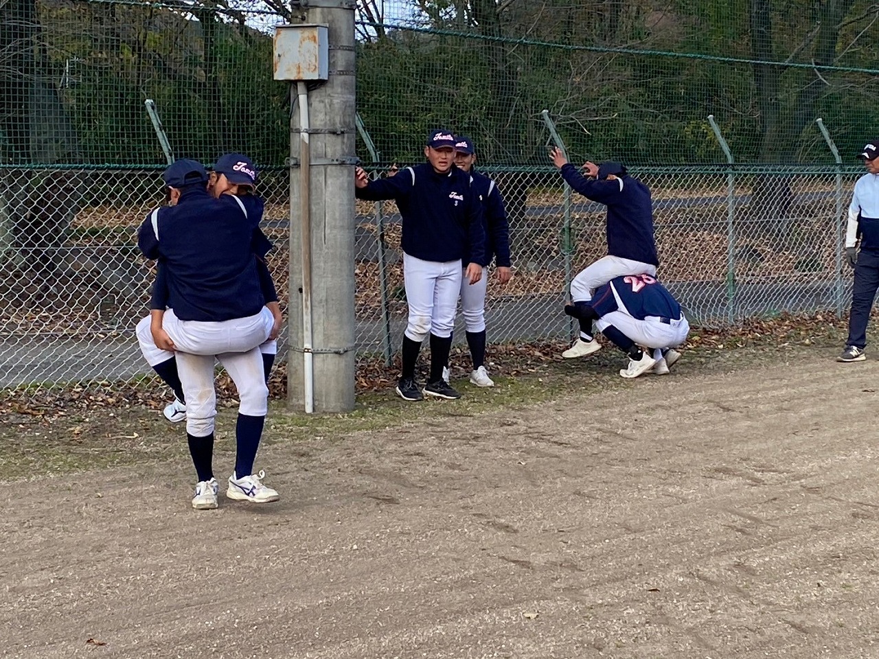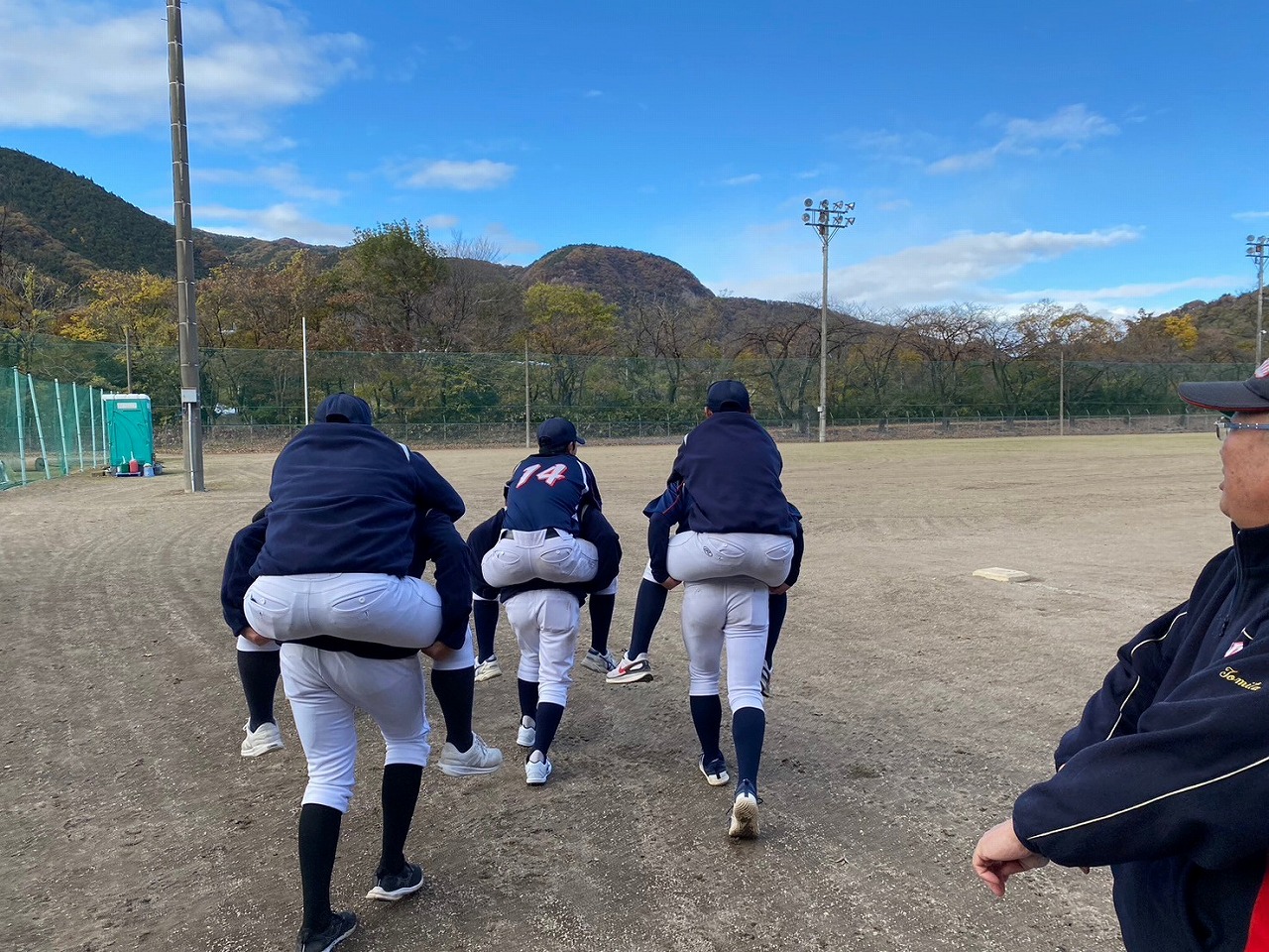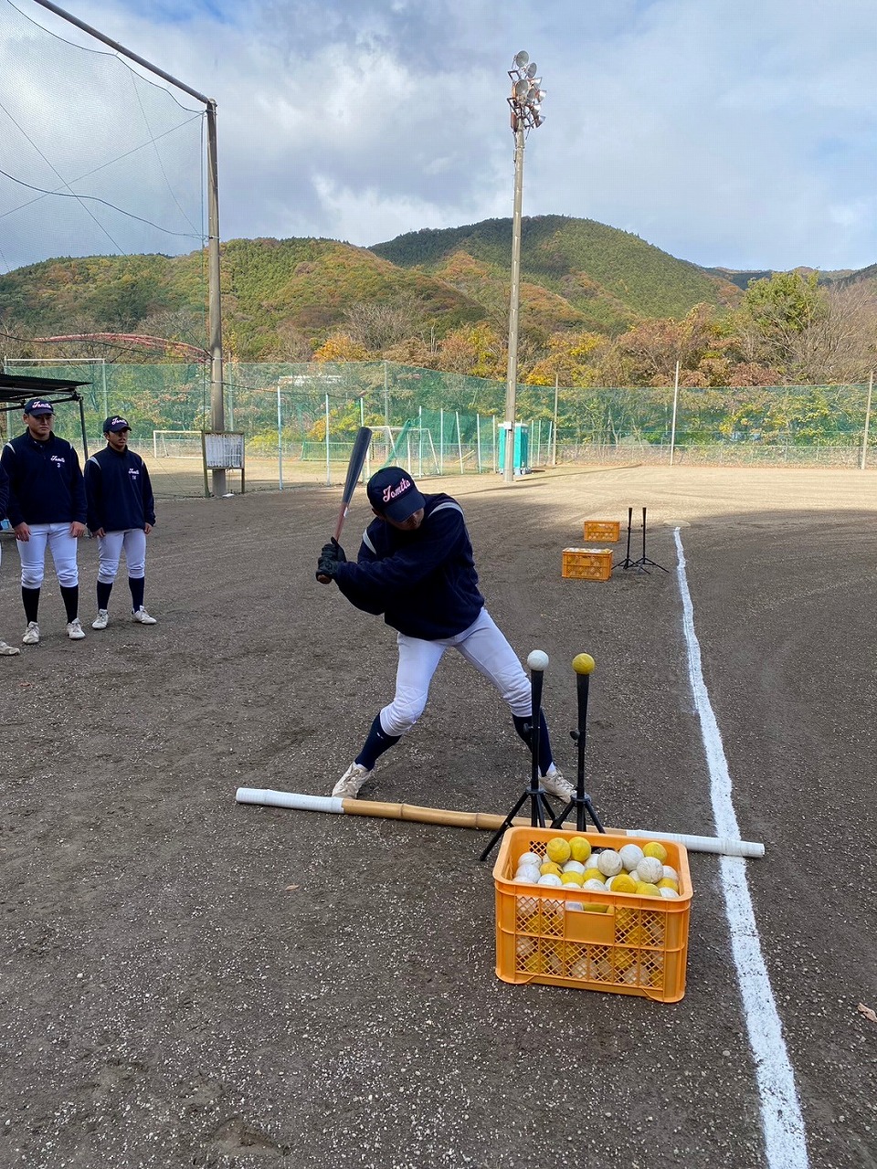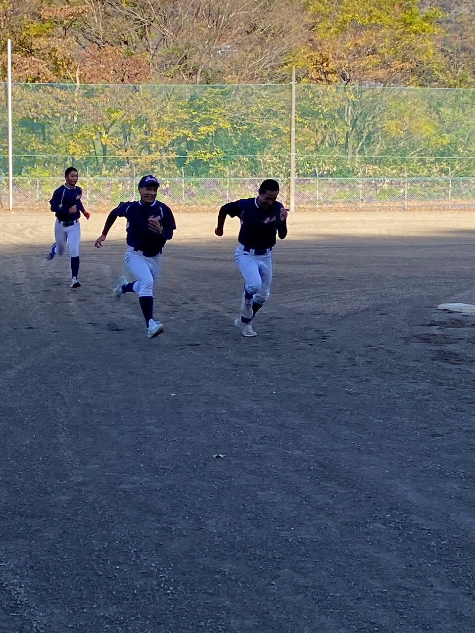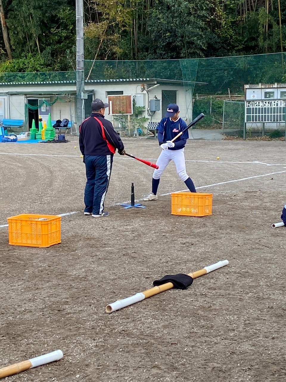 本日も強風で極寒のなか内容の濃い練習が始まりました!12/8に富田塾OBとの交流戦があります。その守備位置や打順を塾生たちで決めるんですが、事前練習をテキパキとこなし、塾長が到着する前に話しあって決めることができました。交流戦楽しみですね!初めにバッティング練習。20cm間隔で前後に置いたティーにボールを乗せ一振りで2球打つ!ミートポイントが前だと当たらない。。。たまに2球ともいい感じに飛ばせるときもあるので、その感覚を忘れずに引き付けて!そして本日のパワー走は10周!!!さすがに何人か顔が青くなっていました。。。その直後におにぎり!スゲー中学生。打った後一塁に走り出す動画を撮りましたが、塾長「もっと早くできるんじゃないか?」。2回目を撮影すると格段に速くなっている。。。塾長「そこに着眼できるかどうかだけでパフォーマンスは向上する!」どこかより良くできるのではないか?と常に意識して臨みたいですね。終盤におんぶ・だっこ・肩車レースをやりましたが、みんなヒーヒー言いながら頑張りました。今日もだいぶ鍛えたね。お疲れ!