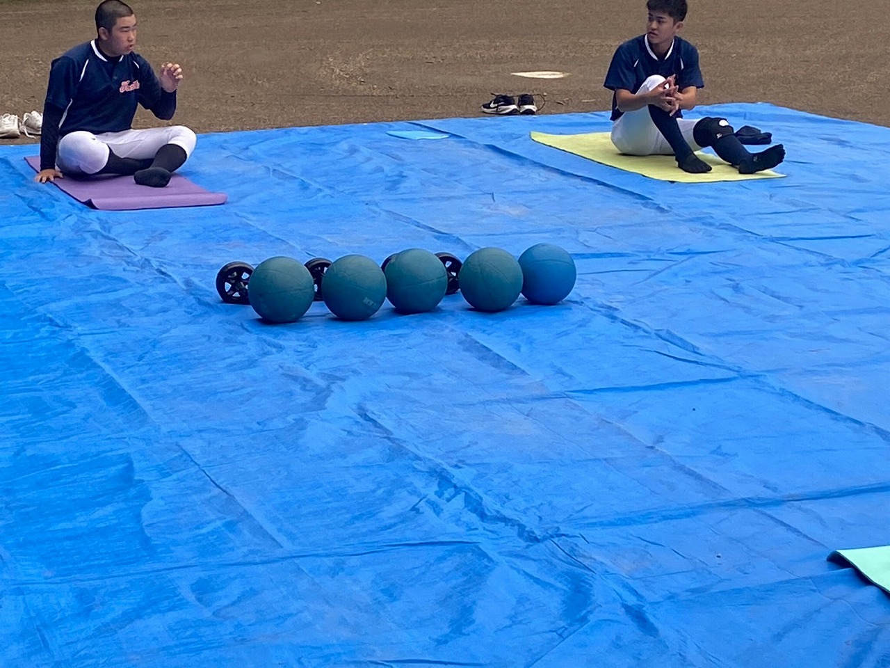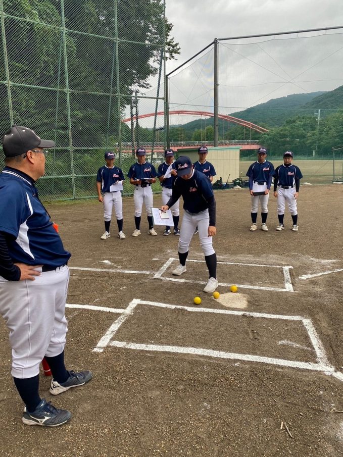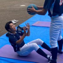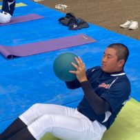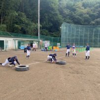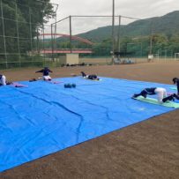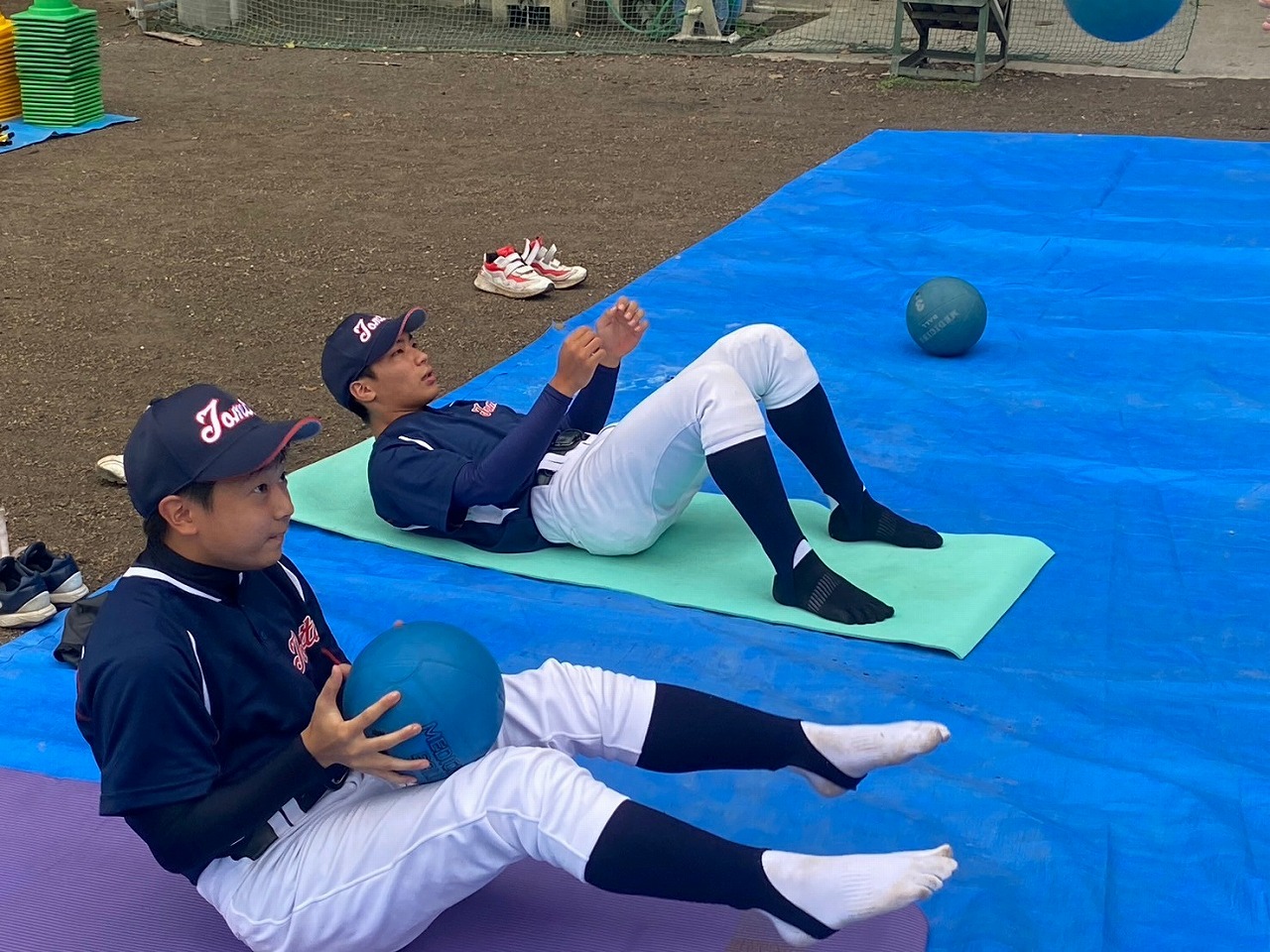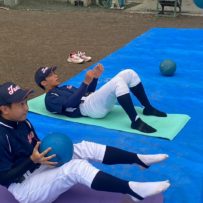 第二回目の練習から腹筋ローラーやメディシンボールを使用しての事前練習が始まりました。道具の準備も含め時間に間に合うよう早めに来ている塾生が多く、事前練習後にバットを振ったり意欲的に行動していました。使った道具をきれいに並べる等、塾長に教わったことを忘れず実行していて保護者としてもホッとする思いでした。スイングや走塁の理論を詳しく教わり、なかなかすぐには出来ないかもしれないけど、繰り返しやることで必ず上達するだろうしパワー走も回数を重ねることで徐々に持久力が高まるでしょうから、全力を出し切って頑張って貰えればと思います。かなりゼーゼーして辛そうですけどね。頑張れ!練習最後に大声で「栄冠は君に輝く」を歌いますが、まだまだ声が小さくて遠慮があるのかな?何も恥ずかしくないんだから自信を持って全力の大きな声を出して貰いたいものです。馬鹿になれ!