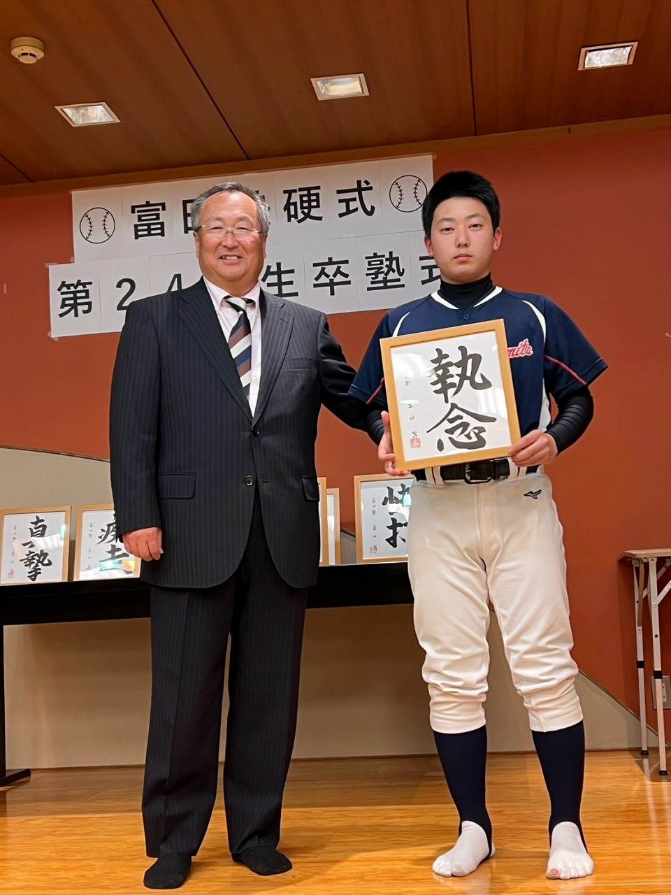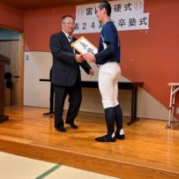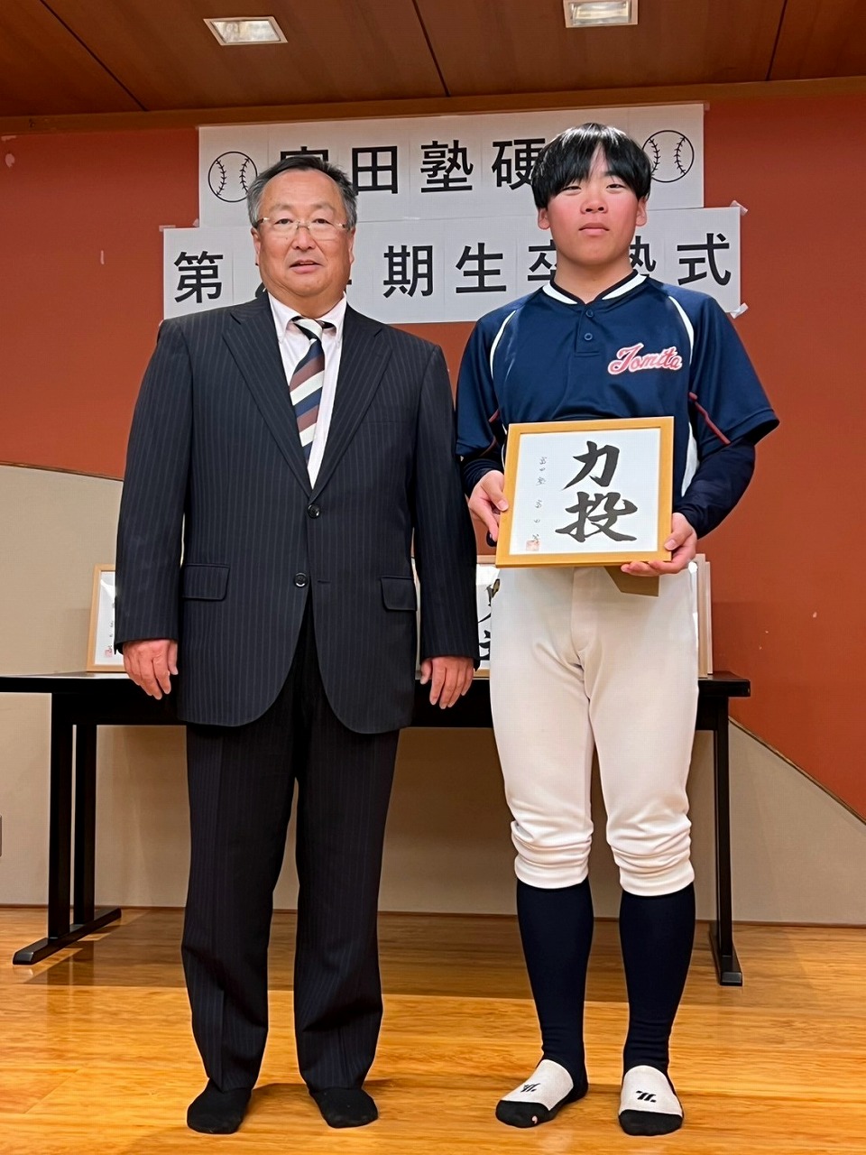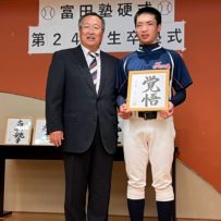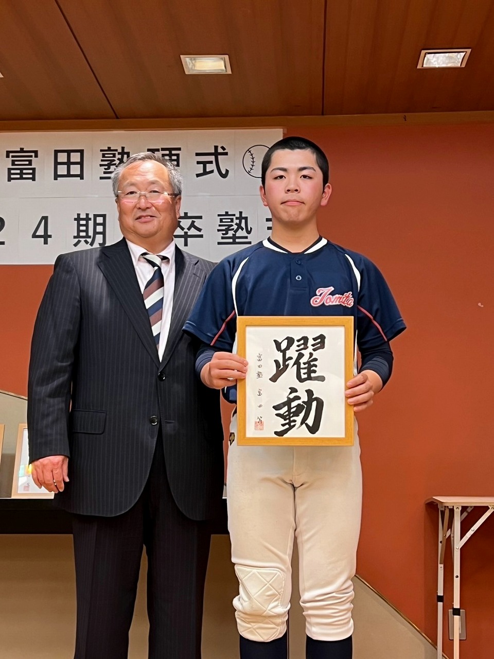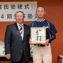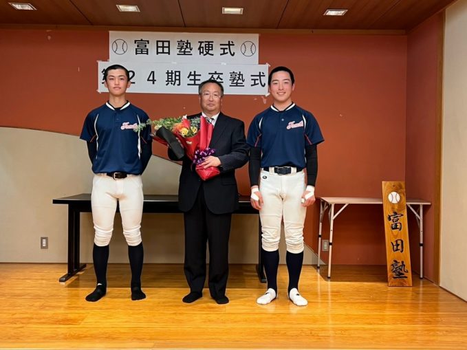 いよいよ最後の時を迎えてしまいました。本日は卒塾式です。富田塾理事の方も参加して下さり、塾生にとって格式高い卒塾式となりました。塾長や来賓の方々から温かいお言葉を頂き、塾生達も決意新たに高校野球へと向かっていけることと思います。式の中頃で半年間の練習の風景を動画にして流させて頂きました。何もかもが思い出深く、塾生達は本当にかけがえのない時間を過ごしたのだなと改めて感じました。各ご家族ごとに壇上にあがり、半年間の思いを話して頂きました。この半年間をとても大切なものだと実感していることが伝わる素晴らしいスピーチを皆がしていました。何度も泣きそうになりましたが、「男は泣いちゃ駄目!」って怒られるから我慢しました。塾生一人一人に塾長から色紙を頂きました。各人への思い出と期待の籠った一言をしたためて頂き、塾長の思いの強さを改めて感じました。これで皆とお別れかと思うと本当に寂しい限りですが、またグランドで会えると信じています。これが始まりなんだよね。富田塾の益々の発展と、皆の活躍を祈念しています!また会おう!
