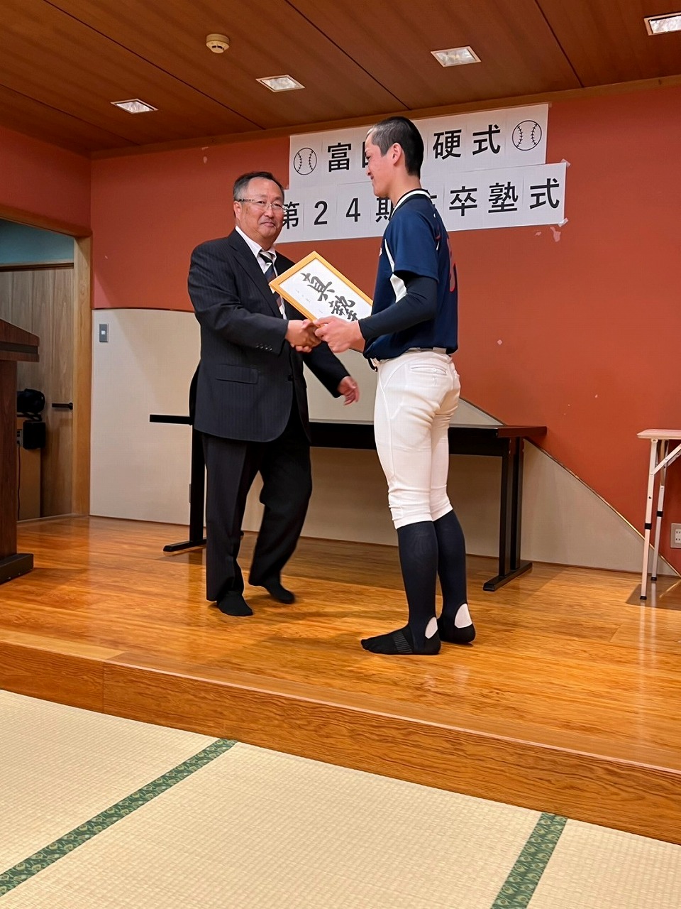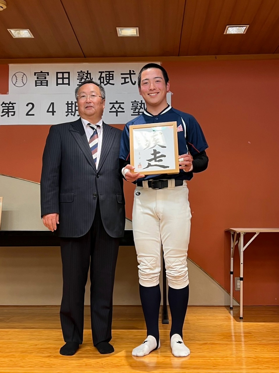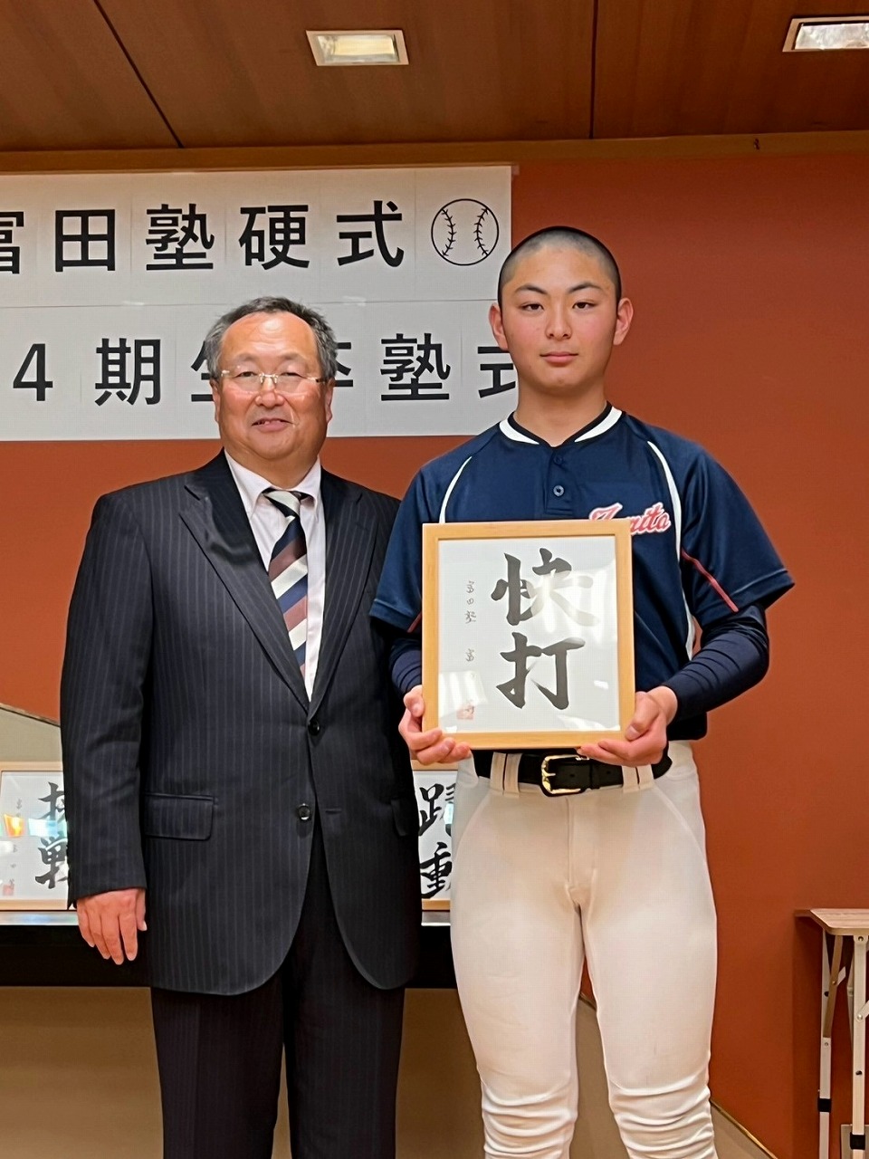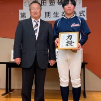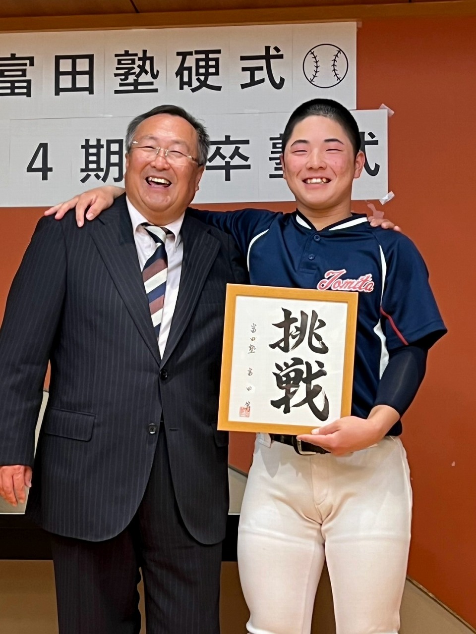 いよいよ最後の時を迎えてしまいました。本日は卒塾式です。富田塾理事の方も参加して下さり、塾生にとって格式高い卒塾式となりました。塾長や来賓の方々から温かいお言葉を頂き、塾生達も決意新たに高校野球へと向かっていけることと思います。式の中頃で半年間の練習の風景を動画にして流させて頂きました。何もかもが思い出深く、塾生達は本当にかけがえのない時間を過ごしたのだなと改めて感じました。各ご家族ごとに壇上にあがり、半年間の思いを話して頂きました。この半年間をとても大切なものだと実感していることが伝わる素晴らしいスピーチを皆がしていました。何度も泣きそうになりましたが、「男は泣いちゃ駄目!」って怒られるから我慢しました。塾生一人一人に塾長から色紙を頂きました。各人への思い出と期待の籠った一言をしたためて頂き、塾長の思いの強さを改めて感じました。これで皆とお別れかと思うと本当に寂しい限りですが、またグランドで会えると信じています。これが始まりなんだよね。富田塾の益々の発展と、皆の活躍を祈念しています!また会おう!