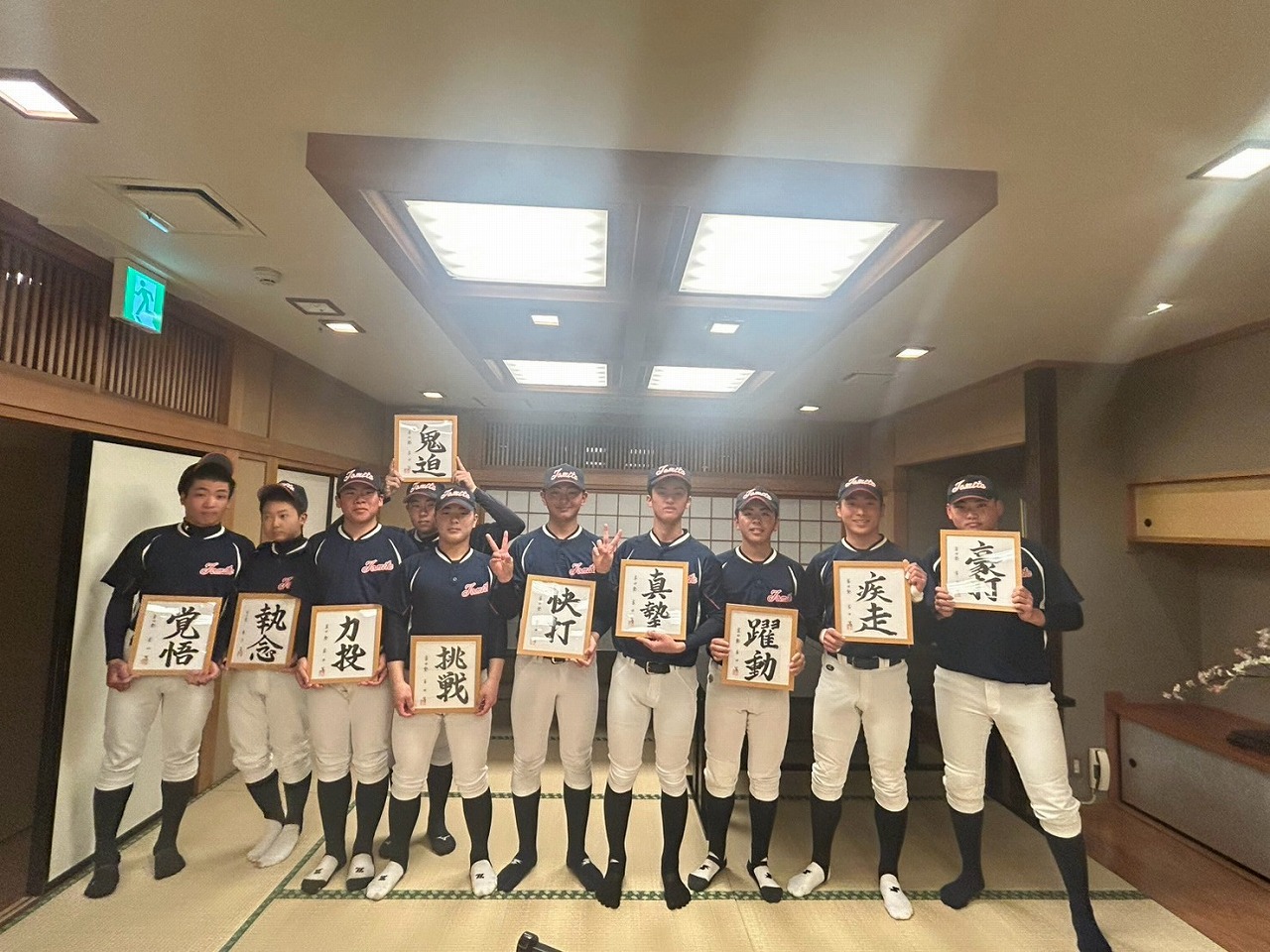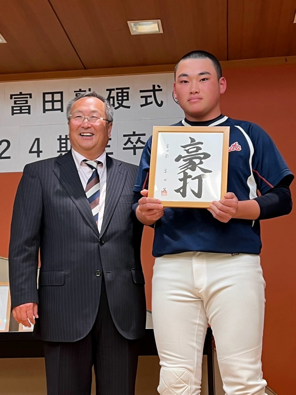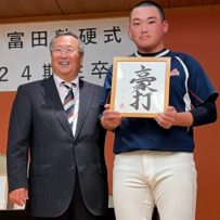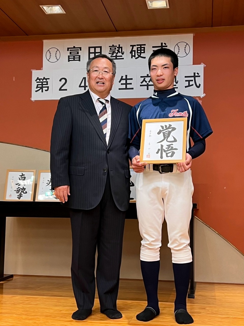 いよいよ最後の時を迎えてしまいました。本日は卒塾式です。富田塾理事の方も参加して下さり、塾生にとって格式高い卒塾式となりました。塾長や来賓の方々から温かいお言葉を頂き、塾生達も決意新たに高校野球へと向かっていけることと思います。式の中頃で半年間の練習の風景を動画にして流させて頂きました。何もかもが思い出深く、塾生達は本当にかけがえのない時間を過ごしたのだなと改めて感じました。各ご家族ごとに壇上にあがり、半年間の思いを話して頂きました。この半年間をとても大切なものだと実感していることが伝わる素晴らしいスピーチを皆がしていました。何度も泣きそうになりましたが、「男は泣いちゃ駄目!」って怒られるから我慢しました。塾生一人一人に塾長から色紙を頂きました。各人への思い出と期待の籠った一言をしたためて頂き、塾長の思いの強さを改めて感じました。これで皆とお別れかと思うと本当に寂しい限りですが、またグランドで会えると信じています。これが始まりなんだよね。富田塾の益々の発展と、皆の活躍を祈念しています!また会おう!