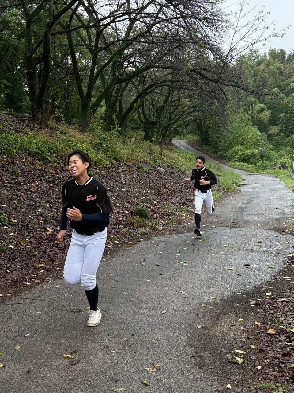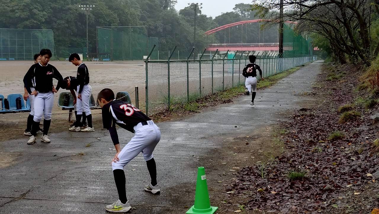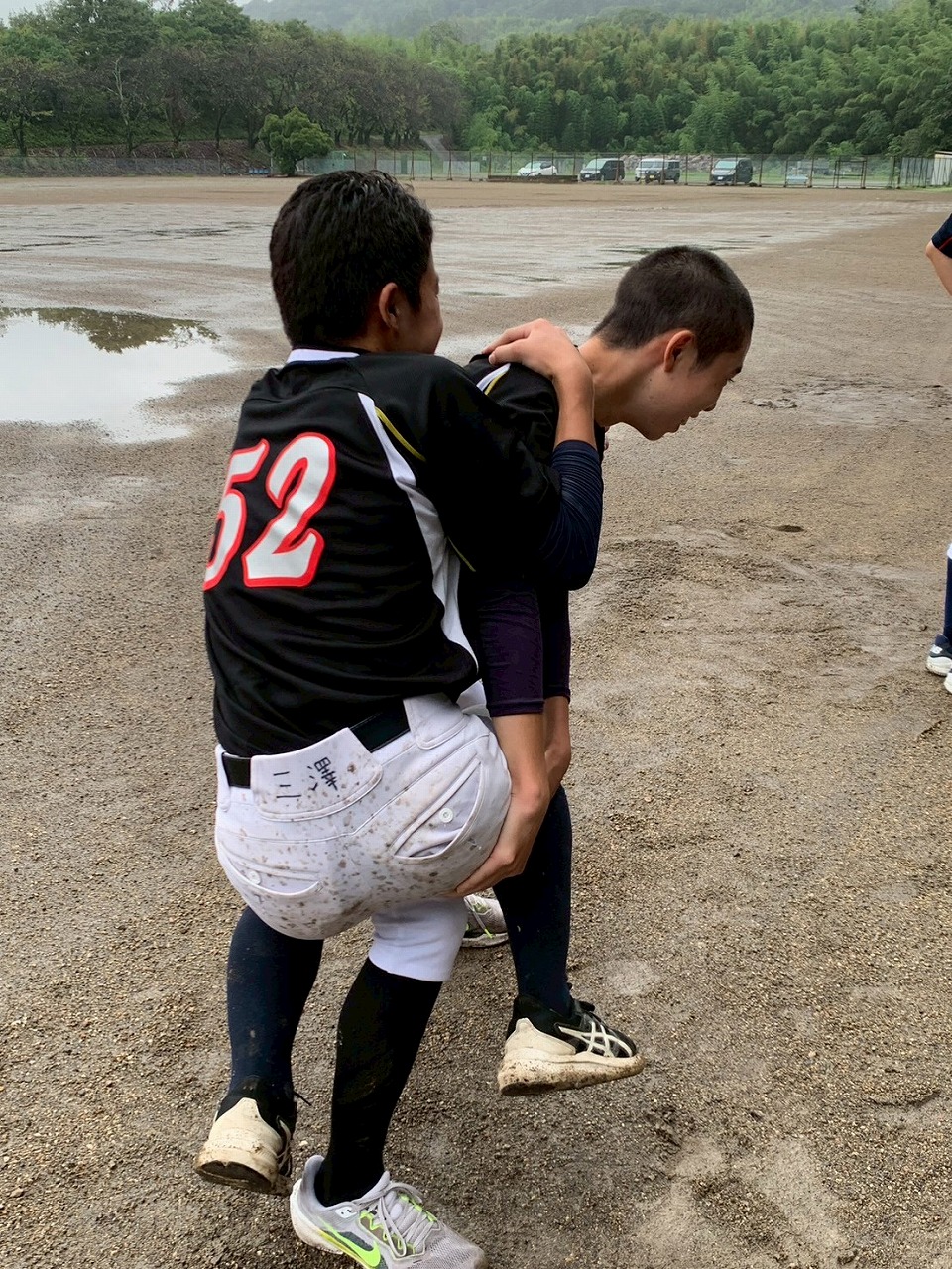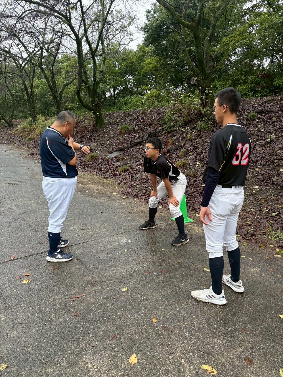 さぁ本日のメニューは⁉ まずは少年野球の塁間で作ったダイヤモンドをメディシンボールを持ってカニさん歩き。曲げている膝よりお尻を下げて横歩き。よいしょ、よいしょ、カニさん歩き。だんだん腰の位置が高くなってく・・・また本日も筋肉痛確定です!お次は~20か所の素振り。どんな球にも対応できるように体に覚えさせることが大事。家での素振りも塾長からのアドバイスを意識して振ってくれているはず…。『継続は力なり』。さてさてお次は~坂道を使ってのランメニュー。アップダウンのあるコースを1周又は2周走り切る前に相手を捕まえる!とても脚力の付く追いかけっこです(笑) これもまた楽しそう(*´▽`*) 雨でぬれた髪をなびかせながら走るイケメンたちよ*がんばれ‼ そしてラストは②人組になって体の周りをグルっと1周回るという、人間観覧車(笑)。『最後まで諦めない‼』←これ一番大事‼あとはコツを掴んでグルっと回ってハイッ出来た!見事に全員クリアしました。