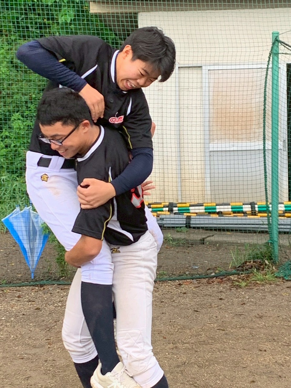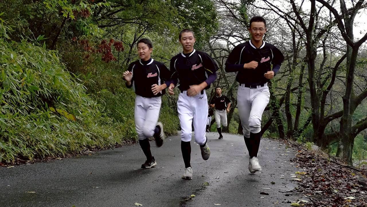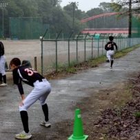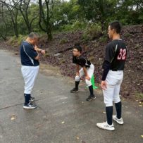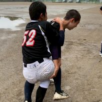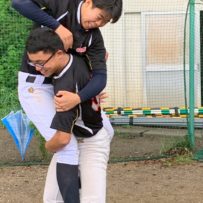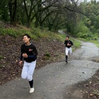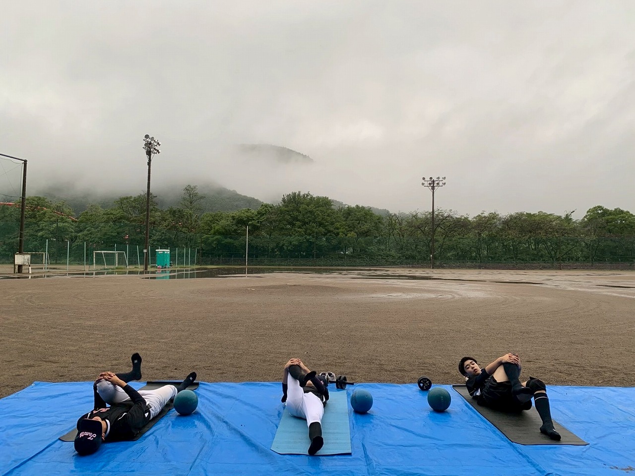 さぁ本日のメニューは⁉ まずは少年野球の塁間で作ったダイヤモンドをメディシンボールを持ってカニさん歩き。曲げている膝よりお尻を下げて横歩き。よいしょ、よいしょ、カニさん歩き。だんだん腰の位置が高くなってく・・・また本日も筋肉痛確定です!お次は~20か所の素振り。どんな球にも対応できるように体に覚えさせることが大事。家での素振りも塾長からのアドバイスを意識して振ってくれているはず…。『継続は力なり』。さてさてお次は~坂道を使ってのランメニュー。アップダウンのあるコースを1周又は2周走り切る前に相手を捕まえる!とても脚力の付く追いかけっこです(笑) これもまた楽しそう(*´▽`*) 雨でぬれた髪をなびかせながら走るイケメンたちよ*がんばれ‼ そしてラストは②人組になって体の周りをグルっと1周回るという、人間観覧車(笑)。『最後まで諦めない‼』←これ一番大事‼あとはコツを掴んでグルっと回ってハイッ出来た!見事に全員クリアしました。