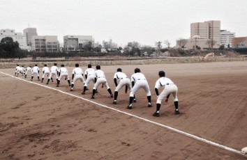 この日は、風はないものの底冷えのする、寒さが厳しい中での練習でした。前商グラウンドをお借りすることができ、走り込みなど下半身や筋力強化の練習、大きなタイヤを引き上げる「プル」、シートノックとバントを中心とした試合形式の練習が行われました。 「プル」では、前回よりもタイムを縮める塾生が多く、見守る保…